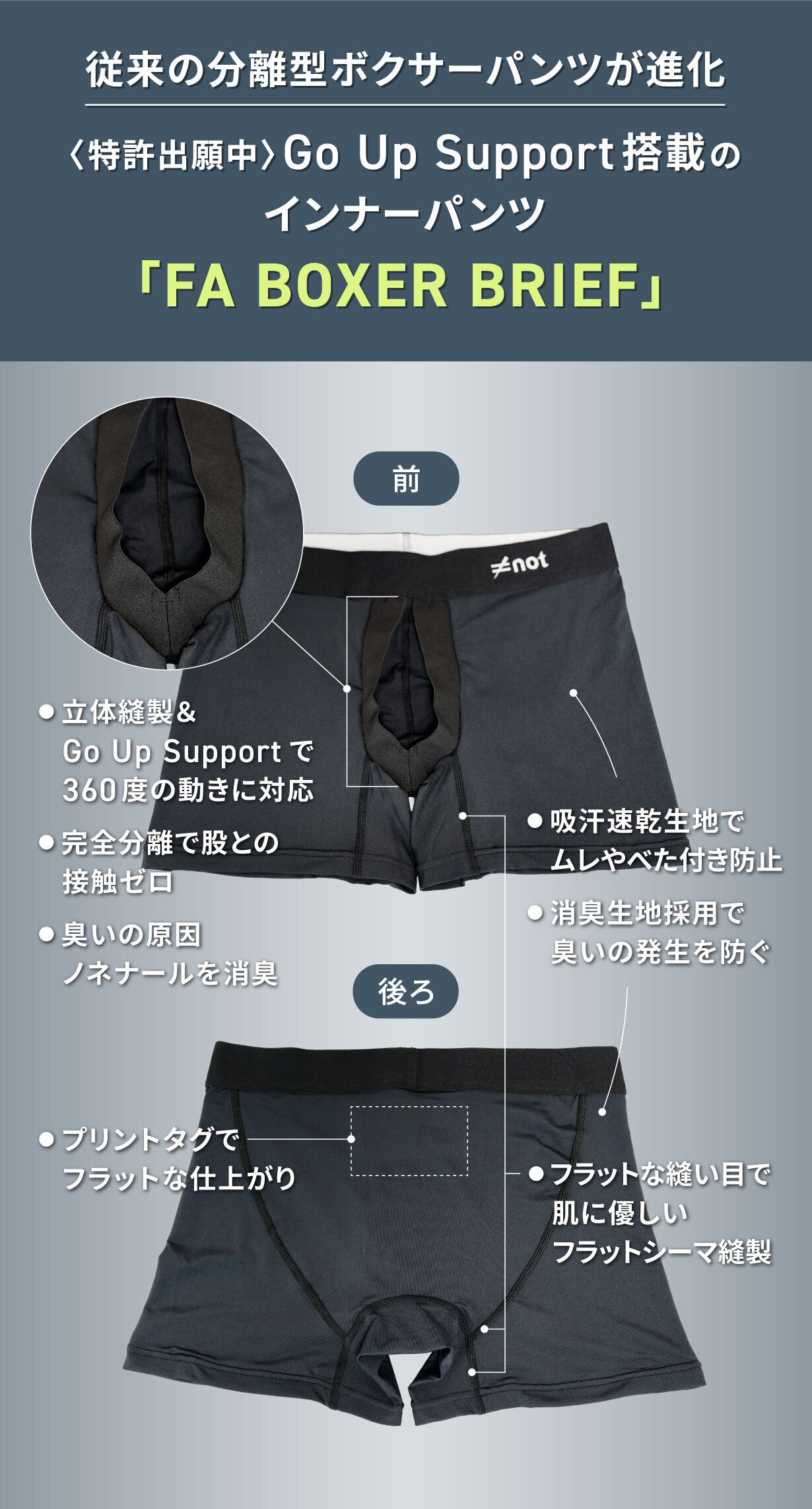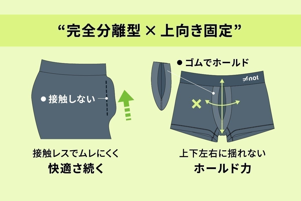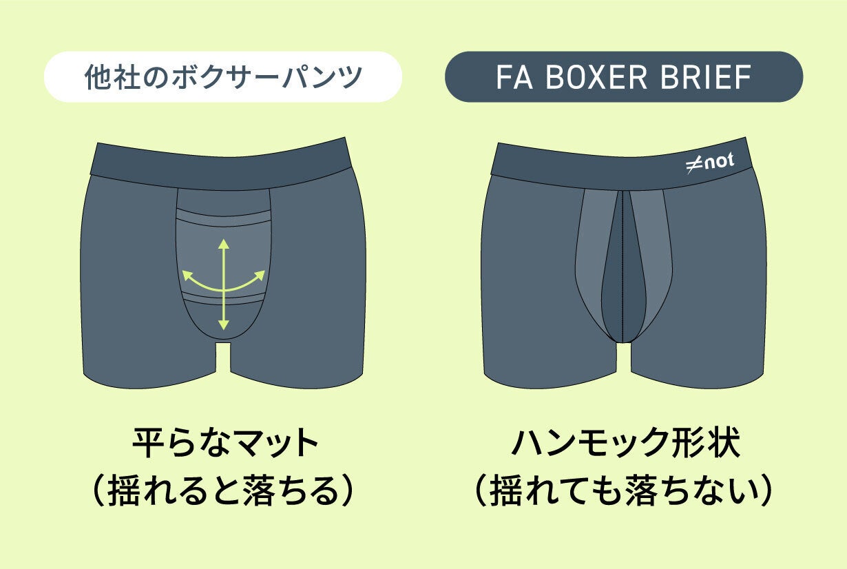 「ポジションが気にならない世界の実現」を目指した完全分離型インナーパンツ「FA BOXER BRIEF」※1は、陰茎と陰嚢を胴体から分離して太ももや部位同士の摩擦レスを実現し、ムレや接触によるベタつきを防ぎます。