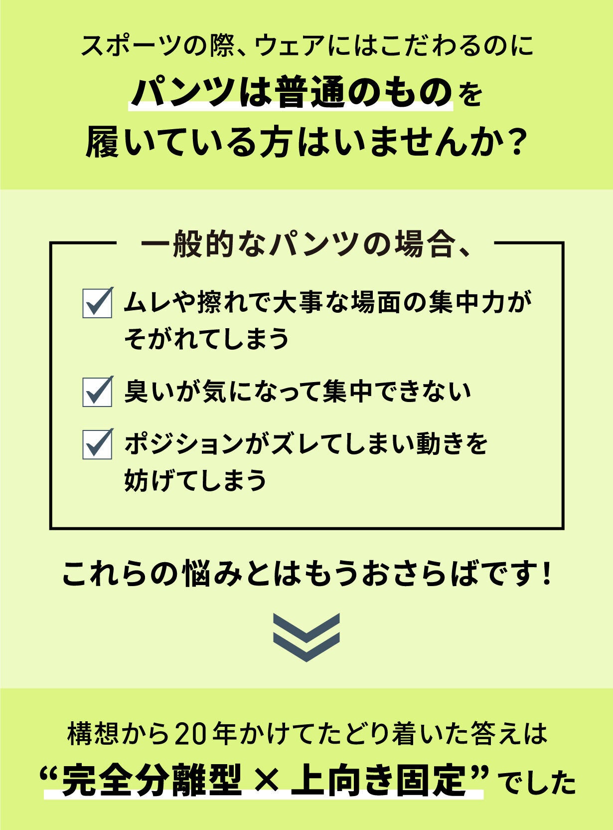 女性用の下着は目的に合わせて様々な形状、素材の物があり、選択肢が豊富な一方で、男性用のパンツは柄と素材がちょっと違うくらいでどれも基本的な構造は同じで選択肢はありません。どれを履いてもポジションは常に定まらず、べたつき、ムレと不快な要素のオンパレード...。世の中の全ての男性がその不快な要素を「当たり前」と感じていると思います。