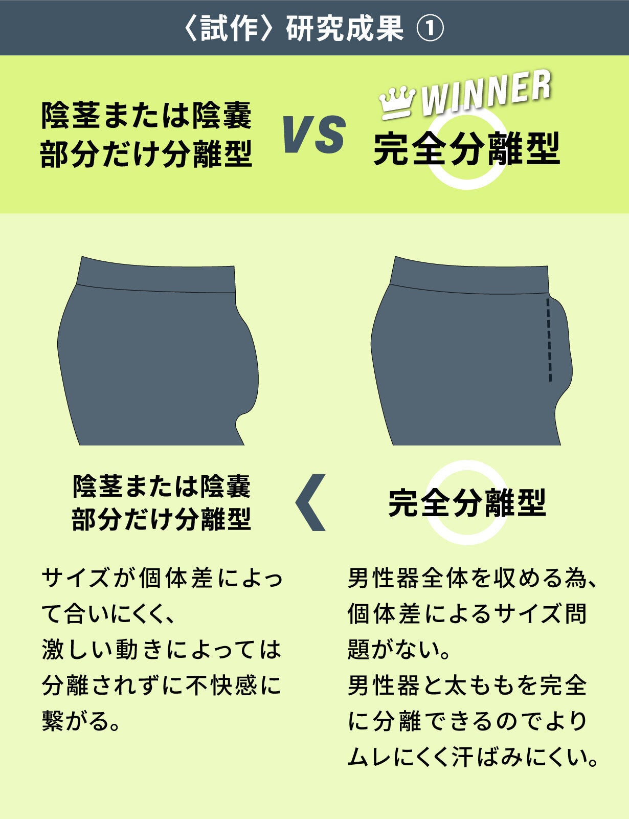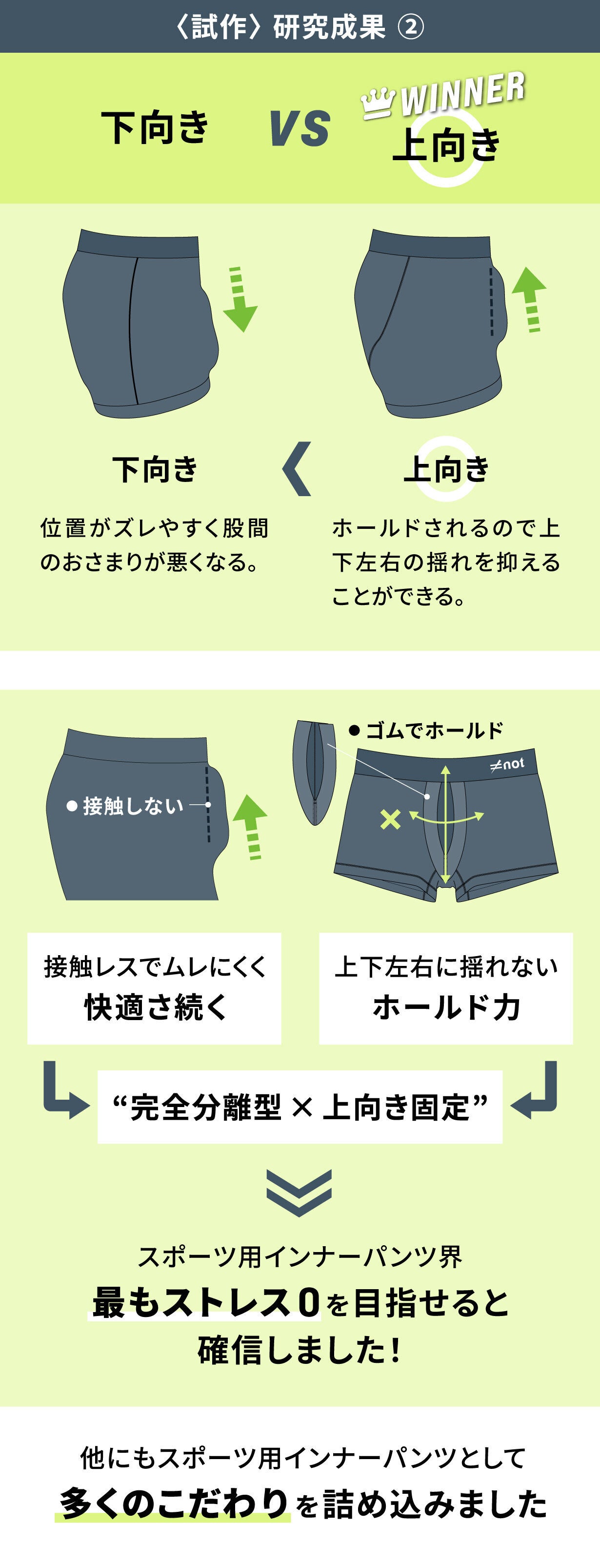分離型ボクサーパンツというもの自体はこれまでも存在はしておりましたが、「FA BOXER BRIEF」の構造は全く異なるもので、アスリートのパフォーマンスを向上させる目的があったので、男性器を上向き固定しながら陰嚢部含めて上に持ち上げて分離することで「揺れない/ブレない」「ふともも部分と股間が接触する事によるロスを無くす」「べたつき/ムレを抑える」3つのことにこだわっていました。