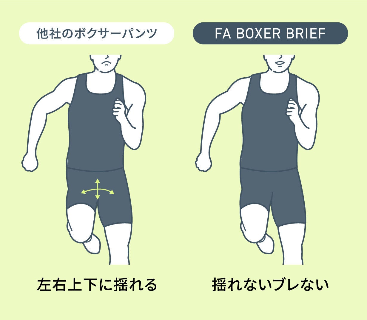男性器は特にスポーツなどをしている時、左右上下に通常揺れますが、「FA BOXER BRIEF」を履けば揺れを軽減します。
