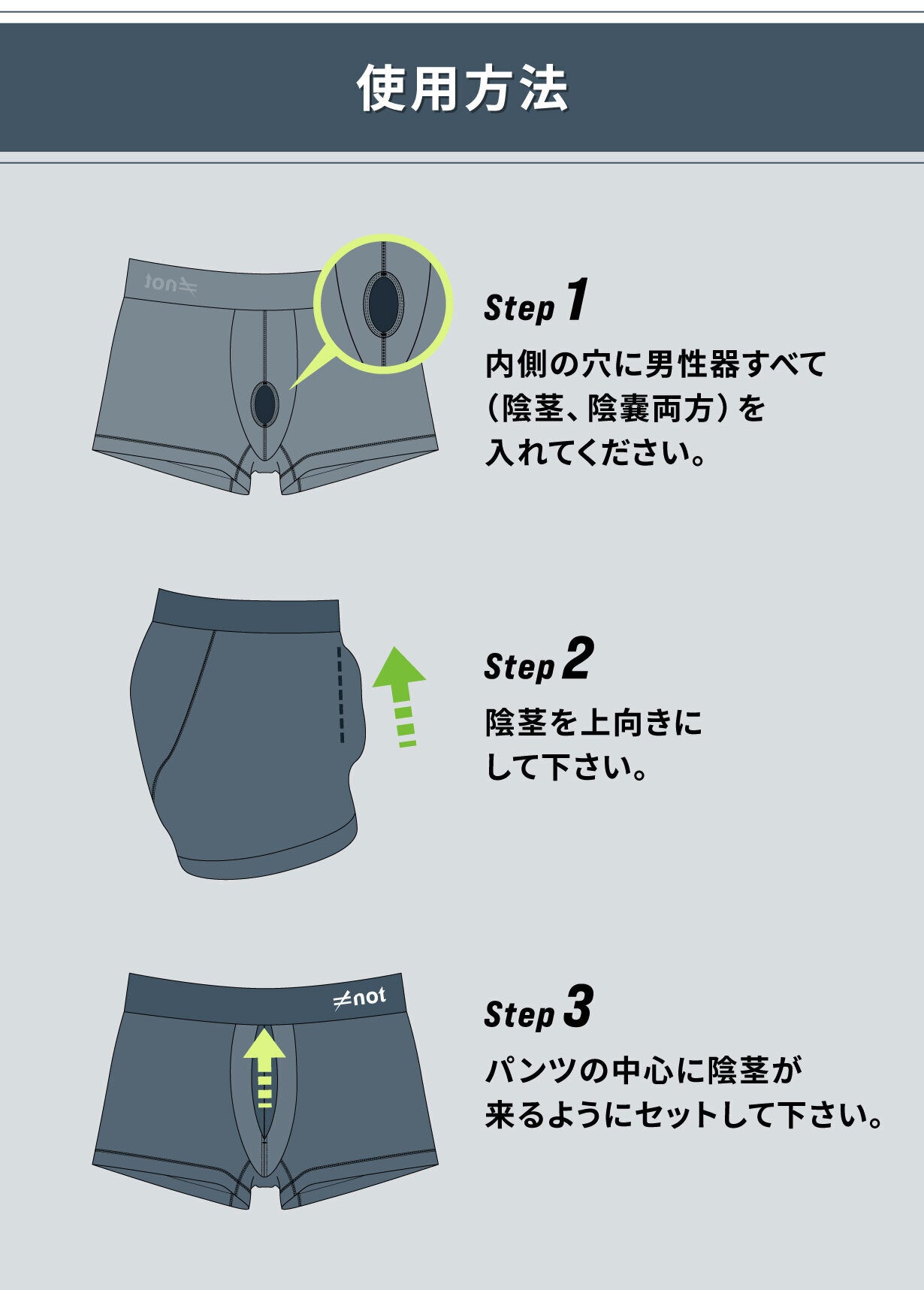 ●本品の前開き(お小水用の隙間のこと)は左右両開きです。※男性器を固定し、運動機能向上を目的とした本品の特性上、前開き部分はタイトな設計になっています。着用したままお小水をするのが難しい場合は、前閉じパンツと同様に脱いでいただきお小水後に再度着用してください。