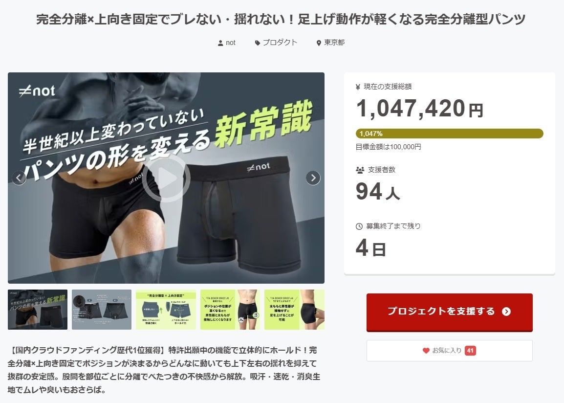 この度は私たちのプロジェクトにご支援いただきありがとうございます。皆様のご支援のお陰で大台の100万円を突破することができ、クラウドファンディングも残すところあと4日となりました。まだご検討中の方は、お得な価格で購入が出来るのは今だけとなります。ぜひこの機会をお見逃しなく!すでにご支援いただいた方は、もしよろしければこちらのプロジェクトをご友人の方やSNSのフォロワーの方々へシェアしていただけますでしょうか。XでシェアするFacebookでシェアする皆様のご支援、応援のお力をお借りして「完全分離型インナーパンツ」を男性用下着の新しい選択肢として広めていき、世の中の男性のパフォーマンスアップに貢献をしていきたいと思っております。よろしくお願いいたします。not合同会社