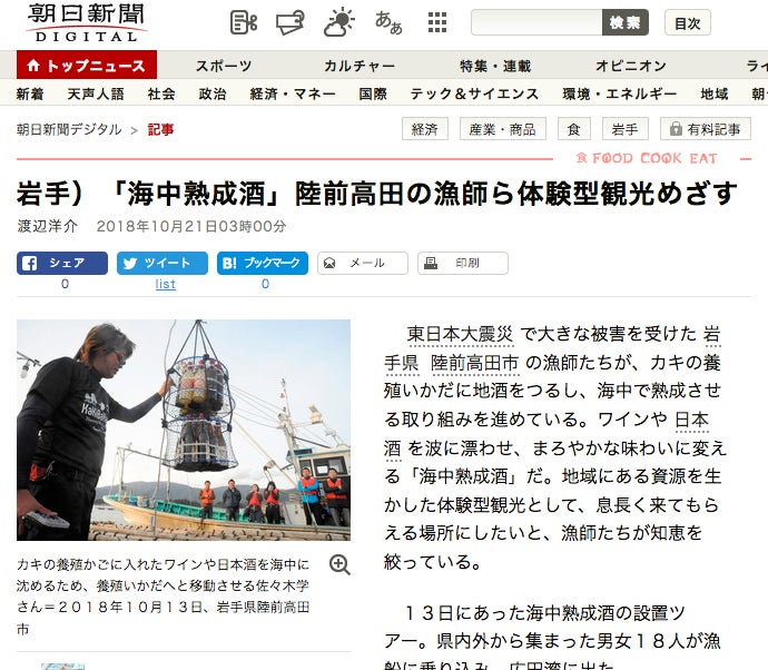 朝日新聞さんに海中熟成の取り組みを取材頂きました。