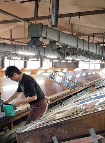 京都の雰囲気と工場の空気を感じながら、鷲野さんと楽しく手捺染体験できます。