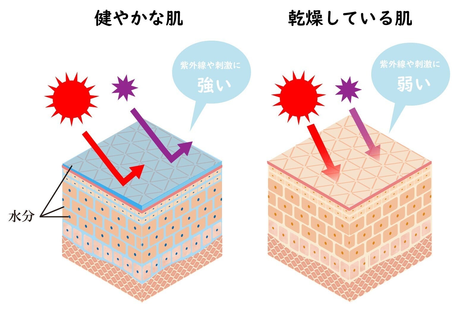 かゆみ・かぶれ・黒ずみは、乾燥による肌のバリア機能の低下が原因です。肌はダメージを受けると、自らを守るためメラニン色素を作り出しますが、バリア機能が低下した肌はダメージをダイレクトに受けてしまうため、メラニン色素をどんどん生成し、黒ずみのもととなるのです。