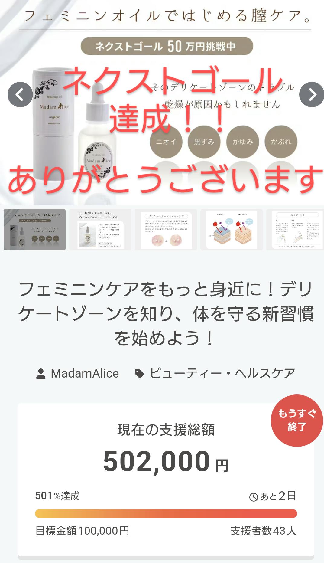 2024/11/28 10:07ご支援くださいました皆様のお陰でネクストゴールの達成をすることが出来ました。心よりお礼申し上げます。これからがスタートだと心に留めて、まだまだフェムケアの大切さをお伝えしていきたいと思います。そして後3日ラストスパートとなりましたが、まだまだ走りますので今後ともどうぞよろしくお願いします。 もっと見る