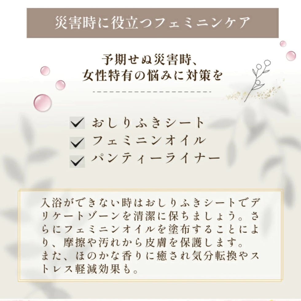 2024/12/13 17:51【災害時に役立つフェミニンケア】今、災害がない所など無いくらいどこに居ても災害に遭ってもおかしくないそんな時に必ずお水が出なくてお洗濯がままならないお手洗いに行くのが大変お風呂に入れない 等そんな時に、ちょっとだけフェミニンケアを知っててもらえたら少しだけでも助けになることをわかってもらえたらと思うまず、揃えておいてほしい物は1.おしりふきシート2.ナプキンやパンティライナー3.フェミニンオイルパンティライナーは平常時は極力使わないけど非常時はこれがとても役に立つ下着が変えられない時でもライナーを交換すれば少しでも清潔が保たれるまず、おしりふきシートで綺麗に拭き綺麗な手(難しい場合はシートにオイルを垂らして塗るだけでも)でデリケートゾーンに塗る保湿されるので乾燥や摩擦から肌を守ってくれるこれだけでも不快から少しだけでも解放されるので使ってもらえたら嬉しい。いざという時だけだと不安もあるし使い方分からないってなるので日々のお手入れとしてフェミニンケアを取り入れてもらいたい少しでも沢山の女性が日々を快適に過ごせるようにと心から願います。#フェミニンオイル#フェミニンケア#フェムケア#災害時持出袋#災害時#トイレ#ナプキン#おしりふきシート#日々のお手入れ#デリケートゾーン#乾燥#こすれ#かゆみ#痛み もっと見る【ご支援下さった皆様ありがとうございました】