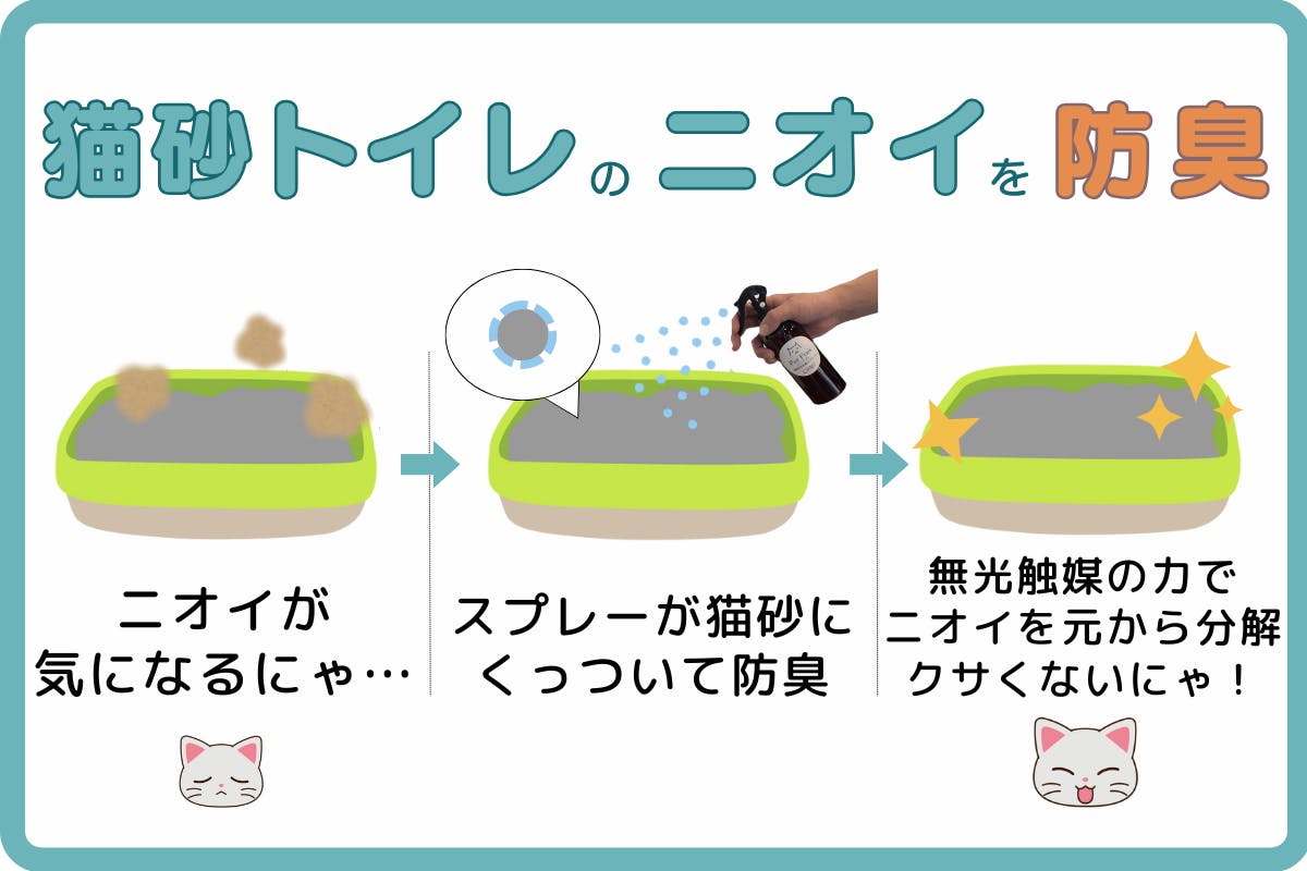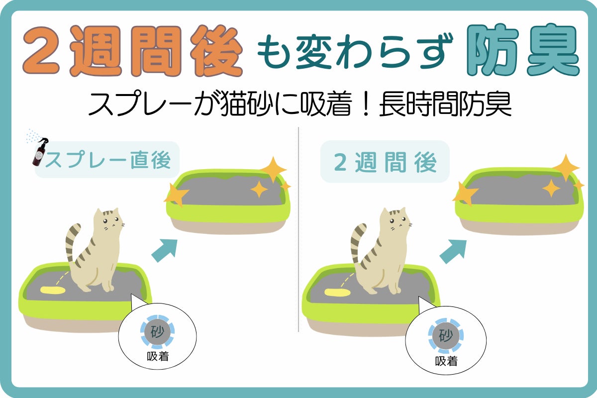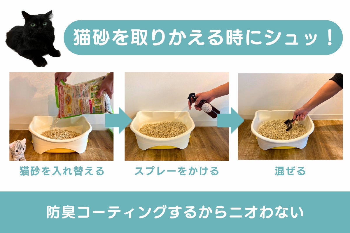 これだけで猫砂が防臭コーティングされ、トイレのニオイを事前に防ぐことができます。
