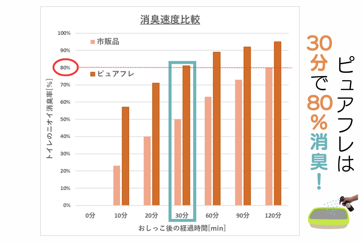 市販品を使用した場合、ニオイ消臭率が80%になるまで120分ですが、ピュアフレの場合は30分なので、市販品で試験した結果より90分早いことが分かります。