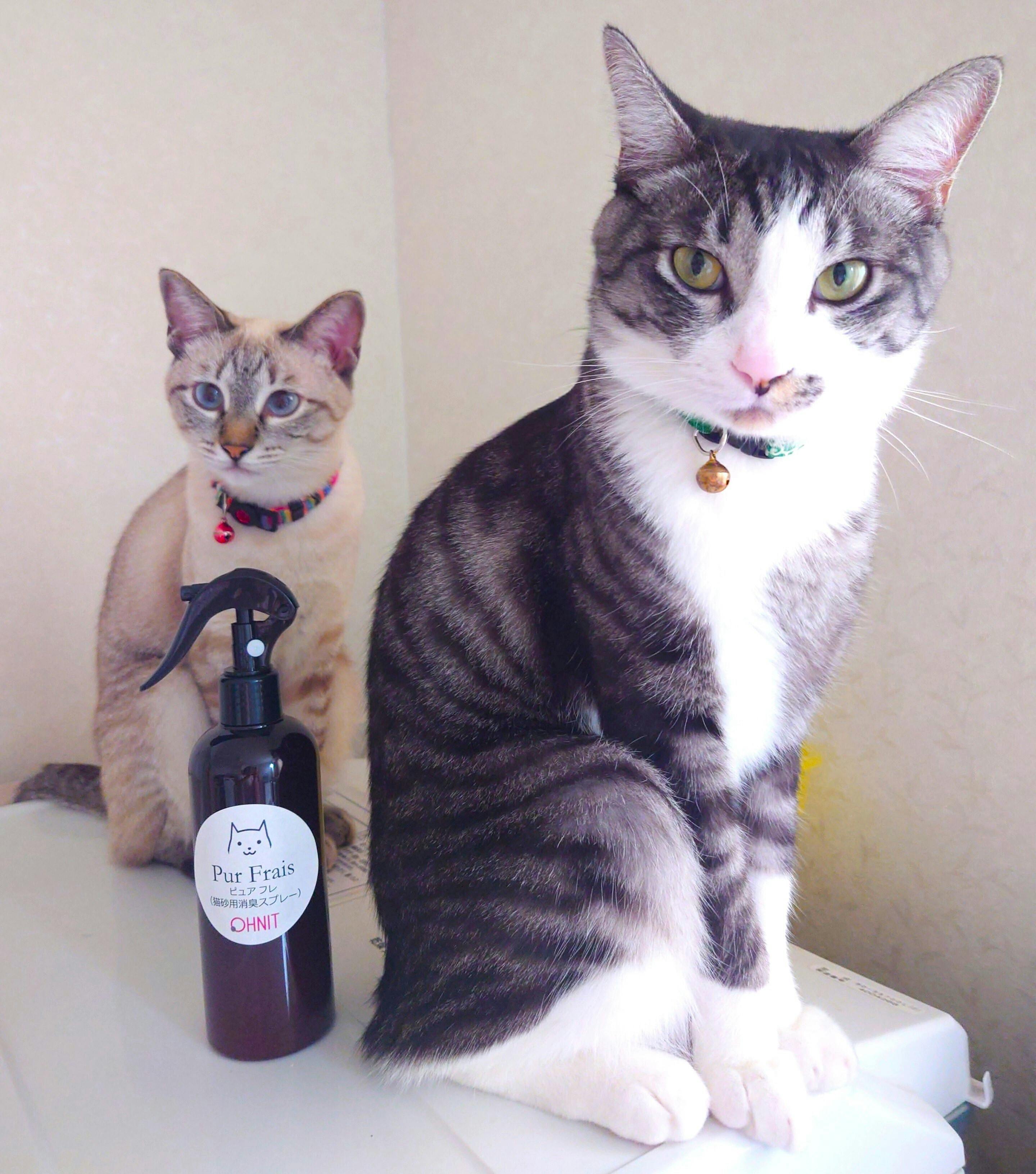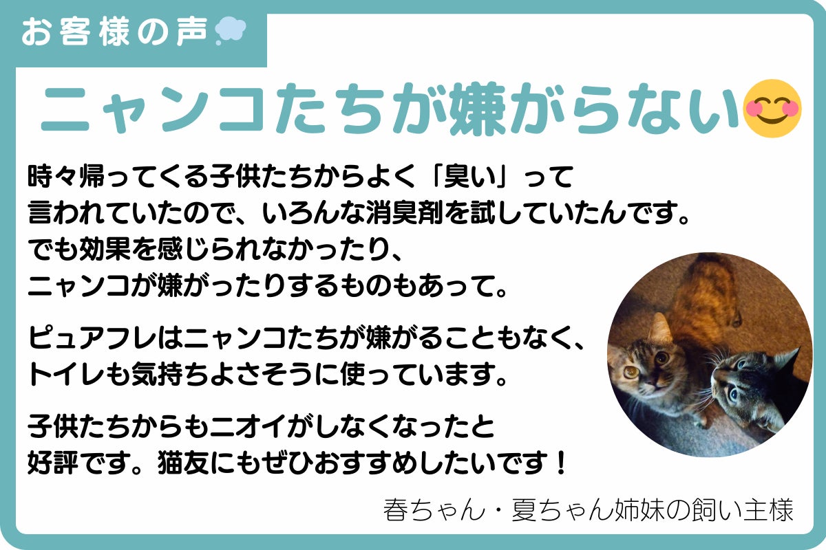 猫たちがトイレをする前にピュアフレをかけておけば、トイレをした後もニオわないようにできるのです。