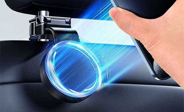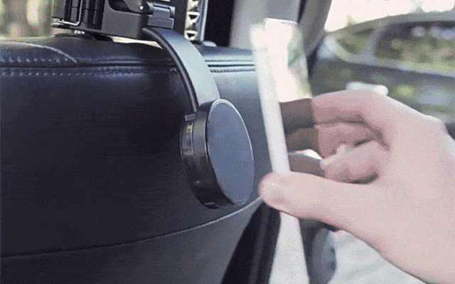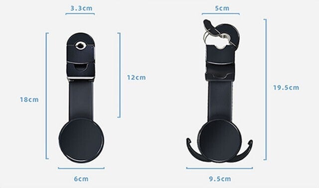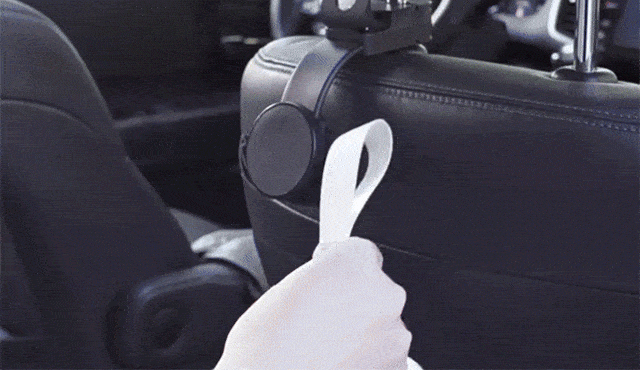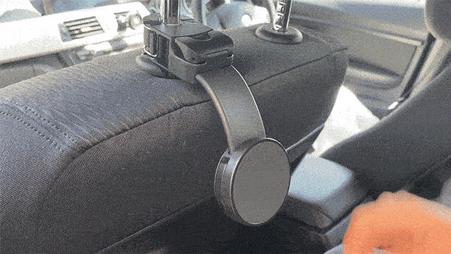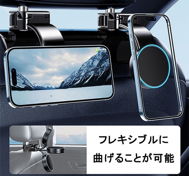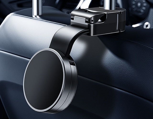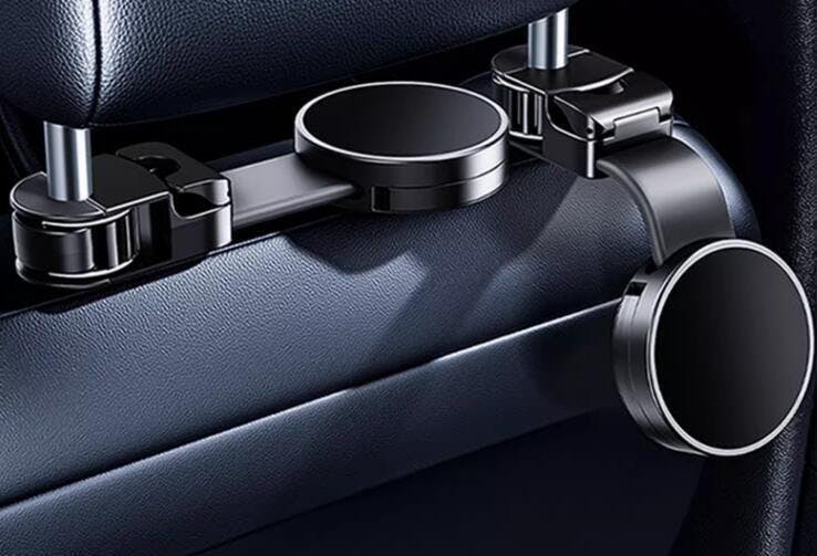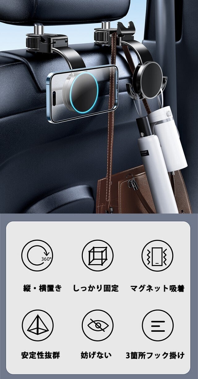 車内にアイテムを掛けられ、さらにマグネットでスマホを固定できるシートフック兼スマホホルダーです。
