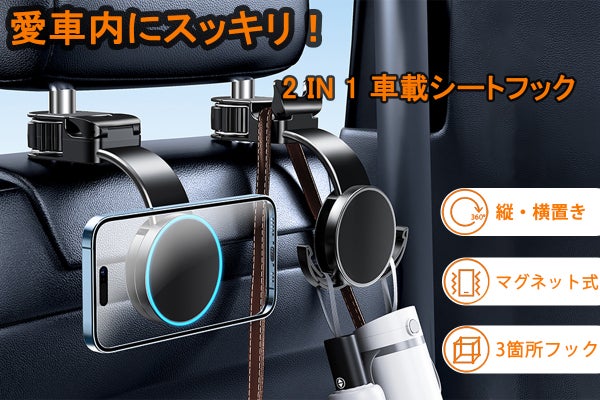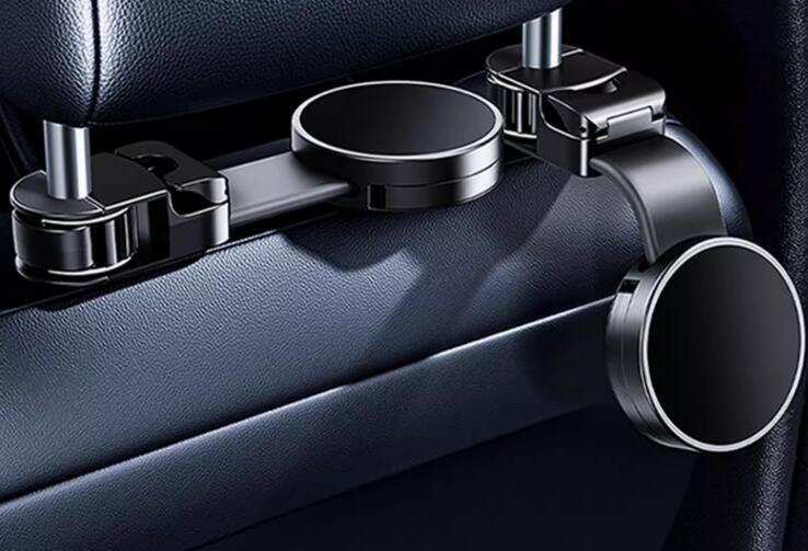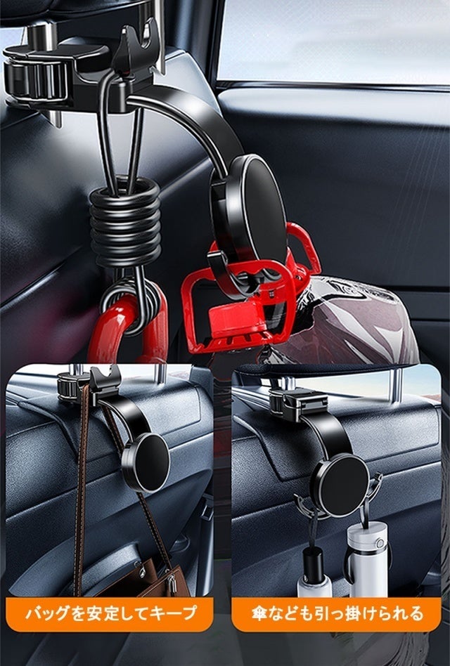 マグネット機能付き、3箇所のフック掛け、多機能車のシートフック。