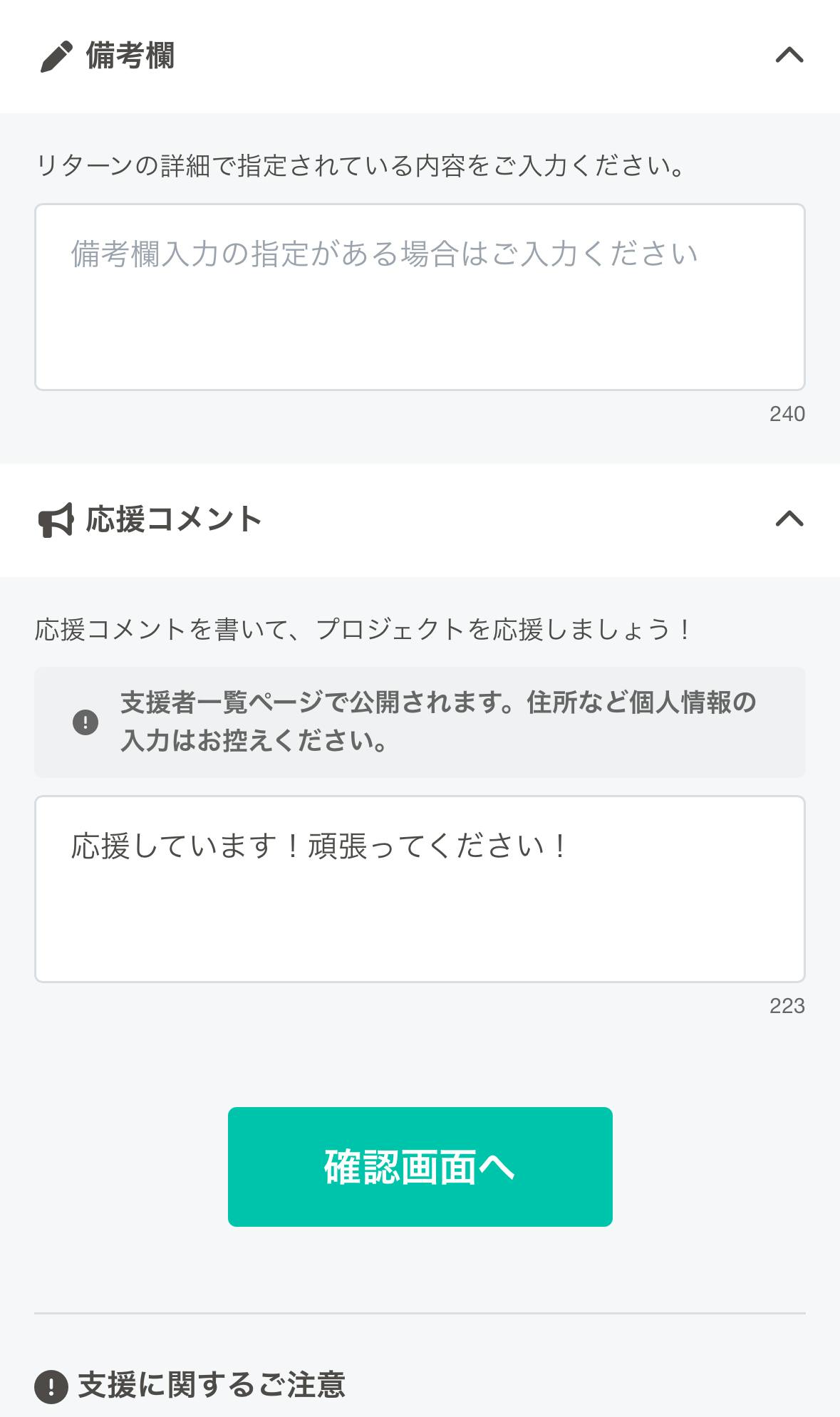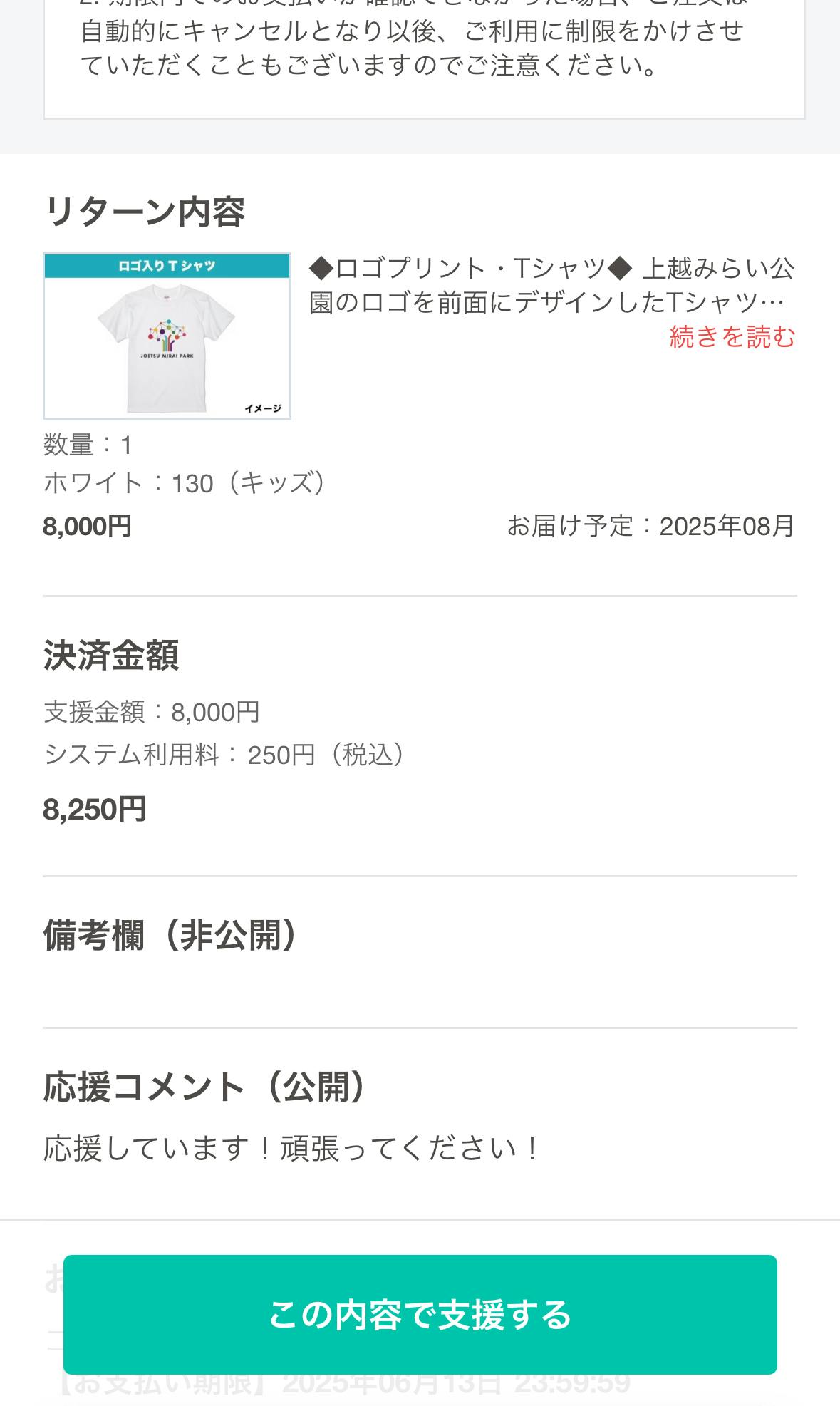確認画面が出てくるので、チェックして問題がなければ「この内容で支援する」を押して、支援完了です!