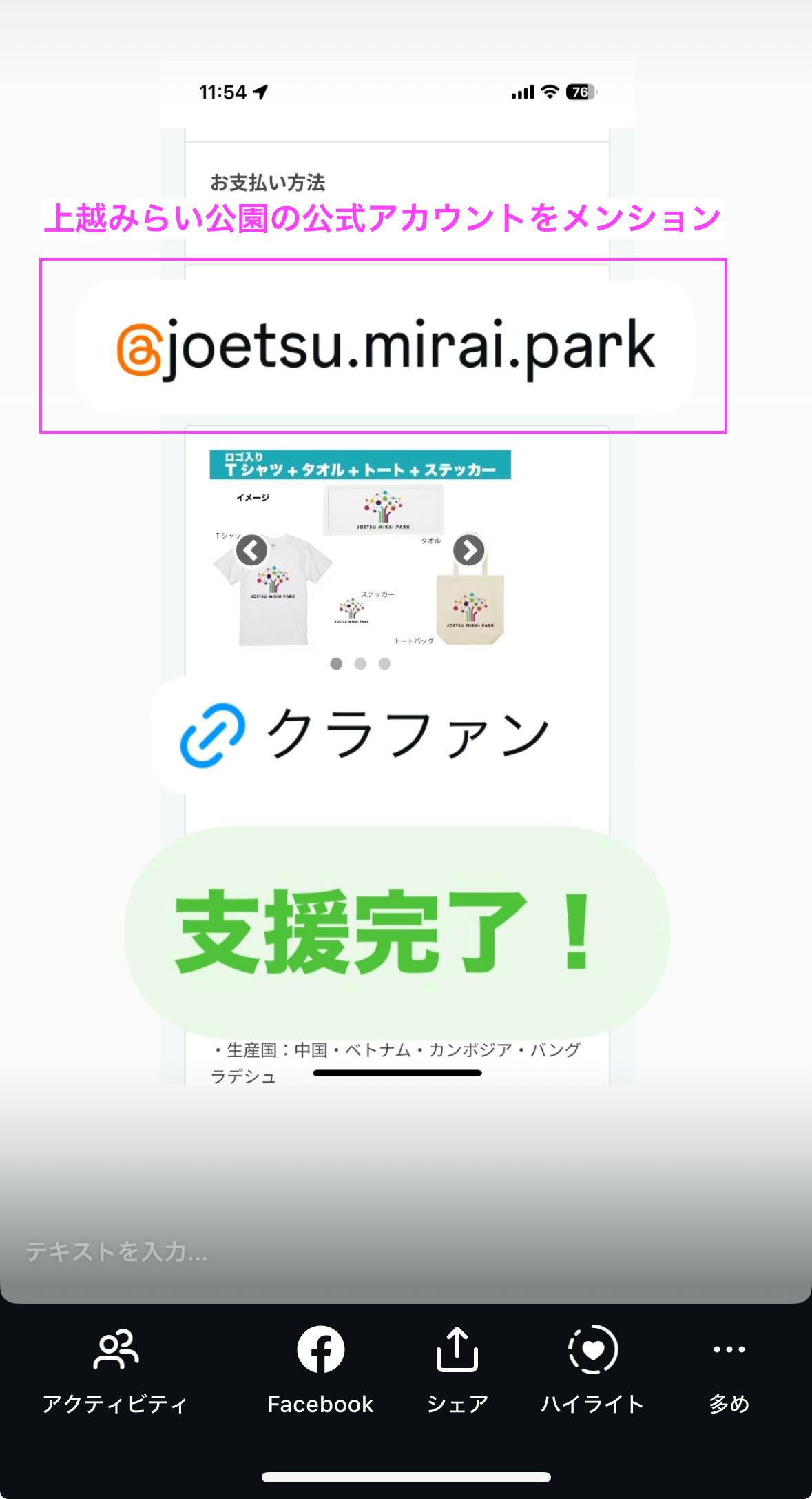 ご支援完了後、Instagramで @joetsu_mirai_park をメンションして、支援したことをぜひ投稿してください!