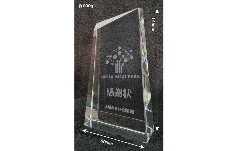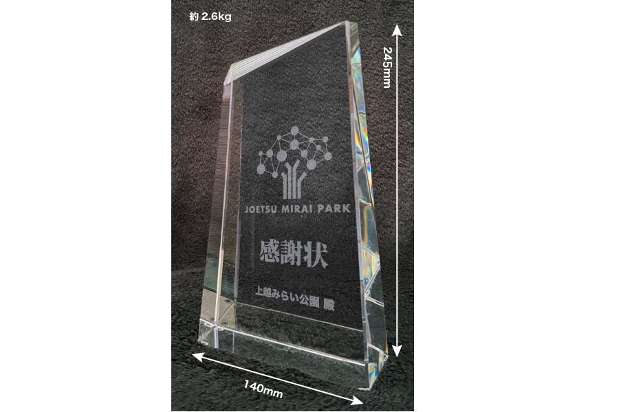 ・ガラス表面に、公園ロゴとご希望のお名前(社名可)をサンドブラスト加工を施します。わずかに透明な白色となる加工部分がクリスタル素材(ガラス)を引き立て、繊細で上品な仕上がりとなる伝統の加工方法です。