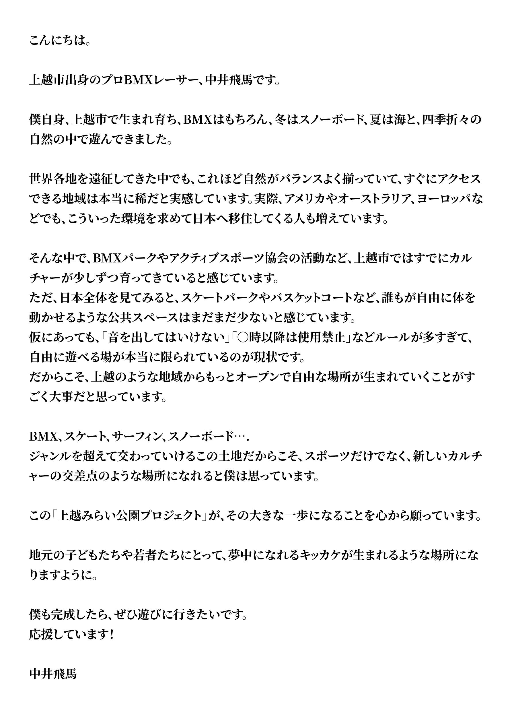 上越市出身のプロBMXレーサー・中井飛馬(Asuma Nakai)さんから、上越みらい公園プロジェクトへ力強いエールが届きました!