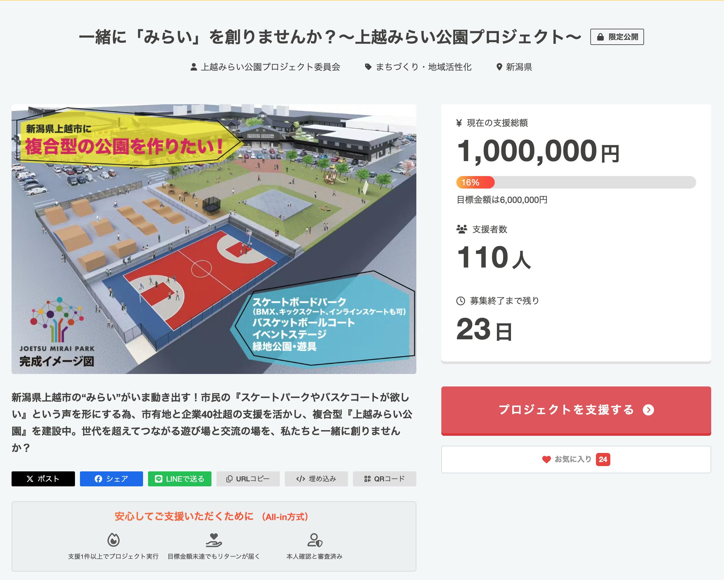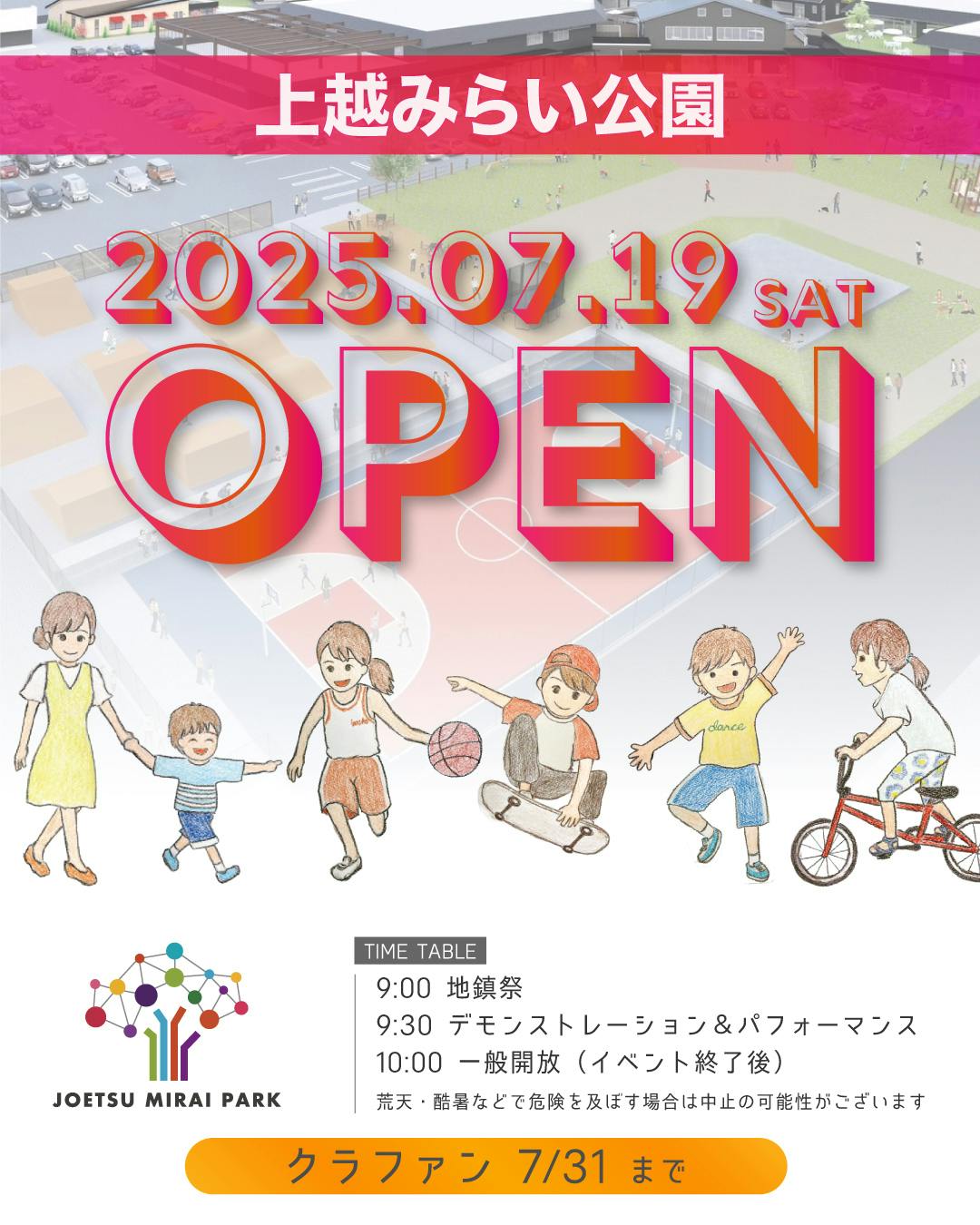 いつも上越みらい公園プロジェクトを応援いただき、ありがとうございます。関係各所との最終調整に時間を要し、直前のご案内となりましたことをお詫び申し上げます。「夏休み前に、子どもたちが思いきり遊べる場所を用意したい」という想いから、まずは最低限の設備でオープンすることを決定しました。■ 2025年7月19日 オープニング当日のスケジュール9:00 地鎮祭(安全祈願)9:35 バスケットボール・デモンストレーション9:40 スケートボード & BMX デモンストレーション9:45 ダンスパフォーマンス(3 チーム予定)10:00 一般開放(自由利用スタート)※ ご利用の際はマナーとモラルを守り、ケガにご注意ください。■ 当日から使える主な設備(すべて無料)・スケートパーク・フルコートバスケットコート・イベントステージ・子ども用遊具・芝生ひろば※ 荒天や猛暑など安全を確保できない場合は中止となる可能性があります。最新情報は公式 Instagram(@joetsu.mirai.park)でお知らせします。■ クラウドファンディング継続のお願い(7 月 31 日まで)設備を充実させるためには、まだ多くの資金が必要です。クラウドファンディングは 7 月 31 日まで継続しております。ご支援・シェアでパークを一緒に育てていただければ幸いです。リンクはプロフィールに掲載しています。■ 来園の呼びかけご家族やご友人をお誘い合わせのうえ、ぜひ 7 月 19 日のオープンイベントにご参加ください。当日の写真や動画を「#上越みらい公園」と「@joetsu.mirai.park」を付けて投稿いただければ、公式アカウントでリポストいたします。今後とも温かいご支援、ご声援をよろしくお願いいたします。