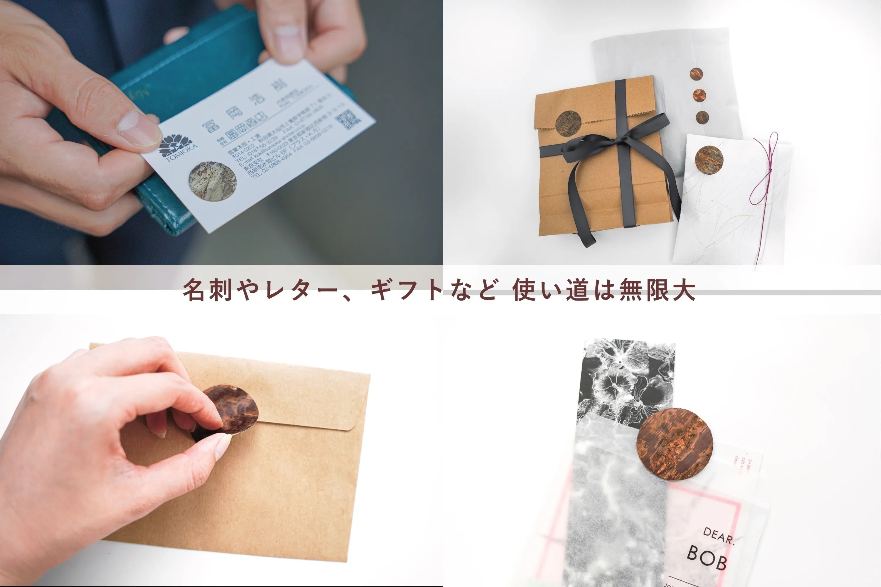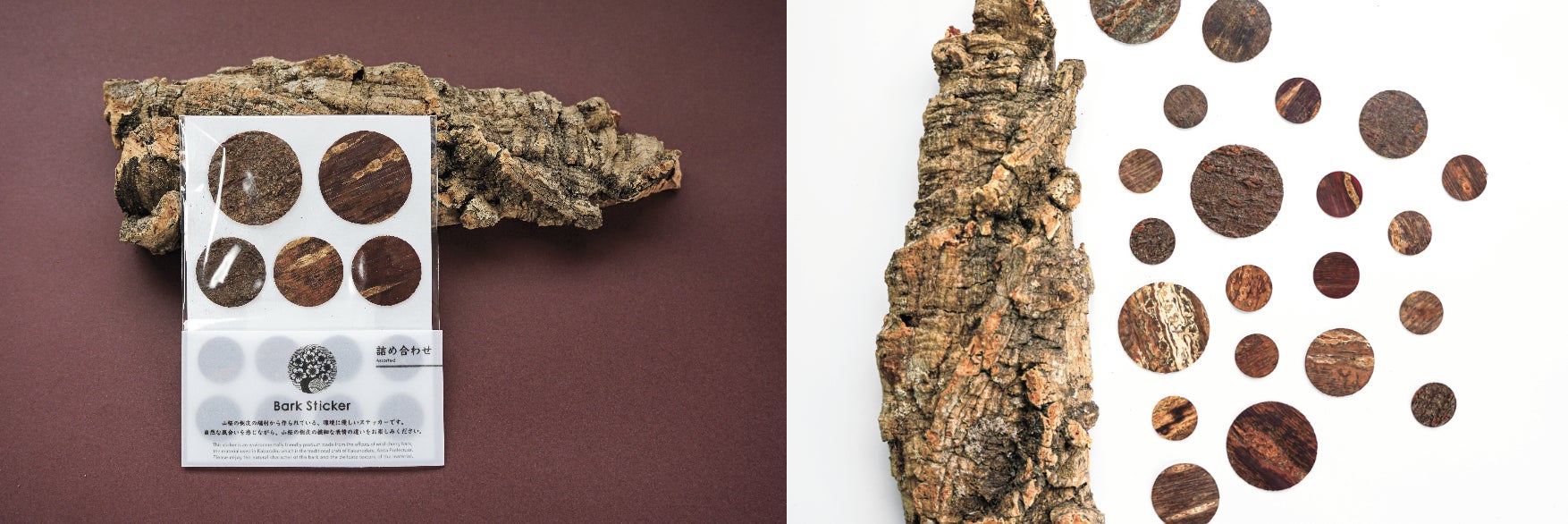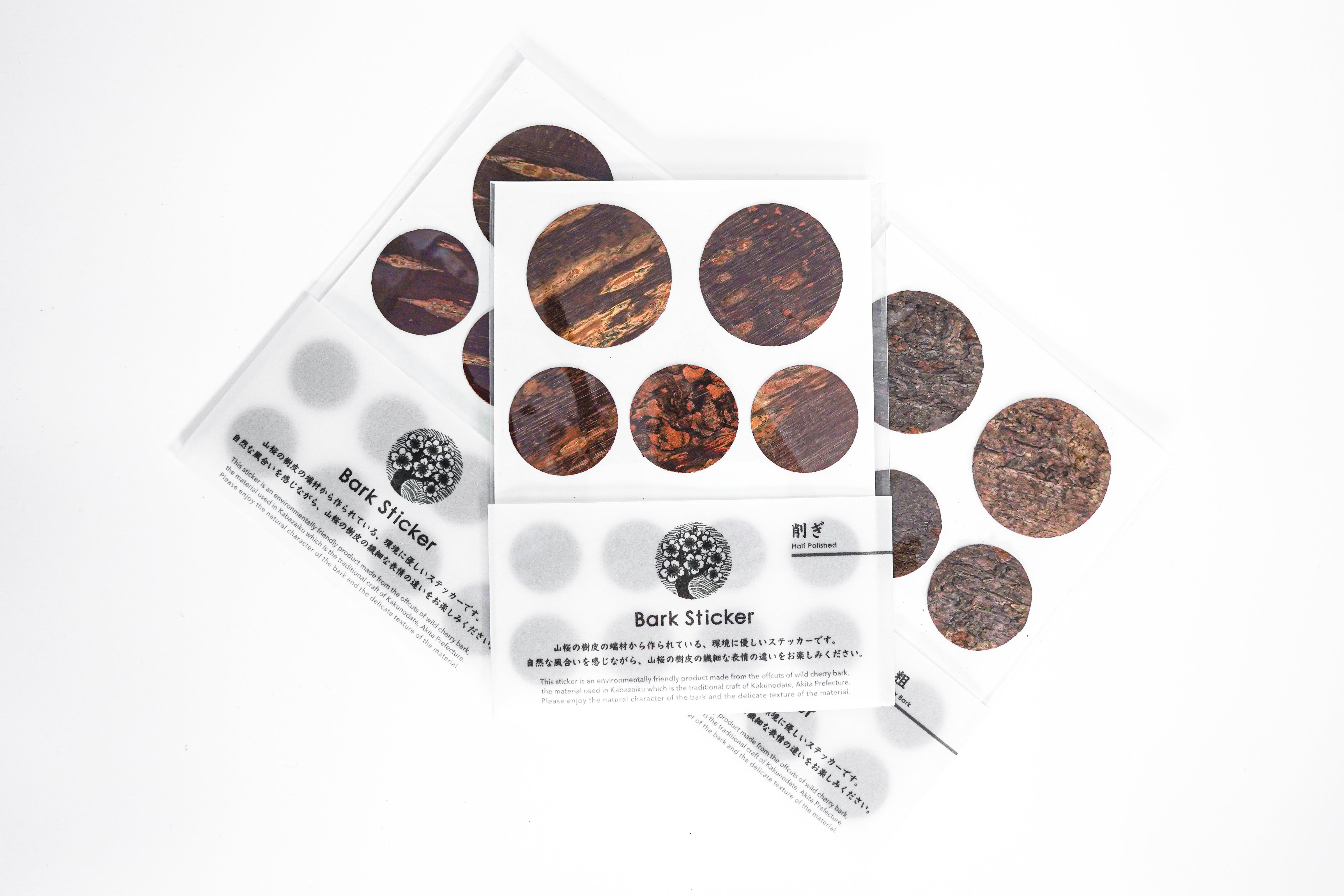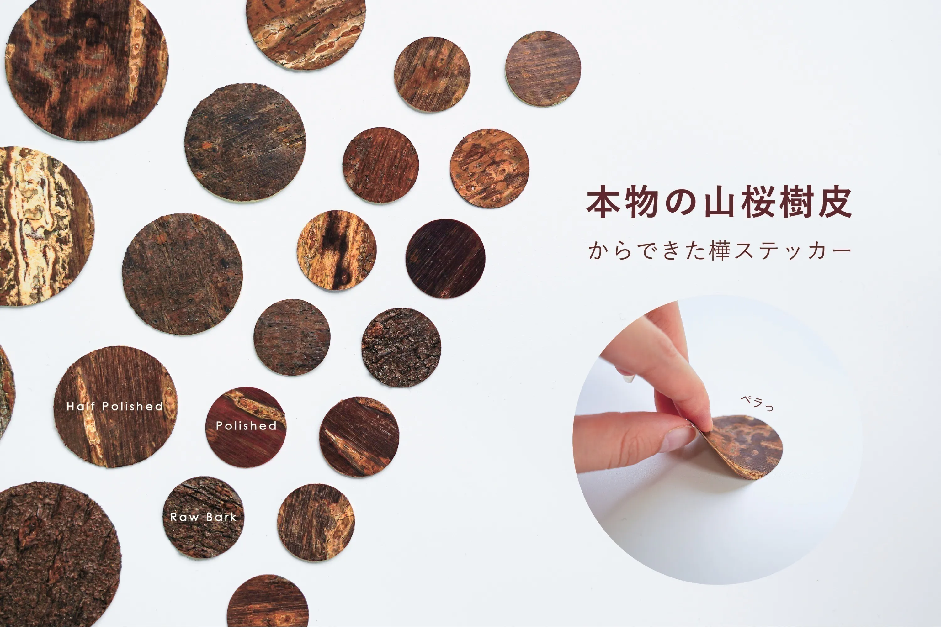 本物の山桜樹皮を切り抜いた、樺細工の風合いを楽しめる贅沢なステッカーです。表面のテクスチャは「粗」「削ぎ」「磨き」3種類の展開で、樺細工の伝統を引き継いだ表情はそれぞれが全く異なります。