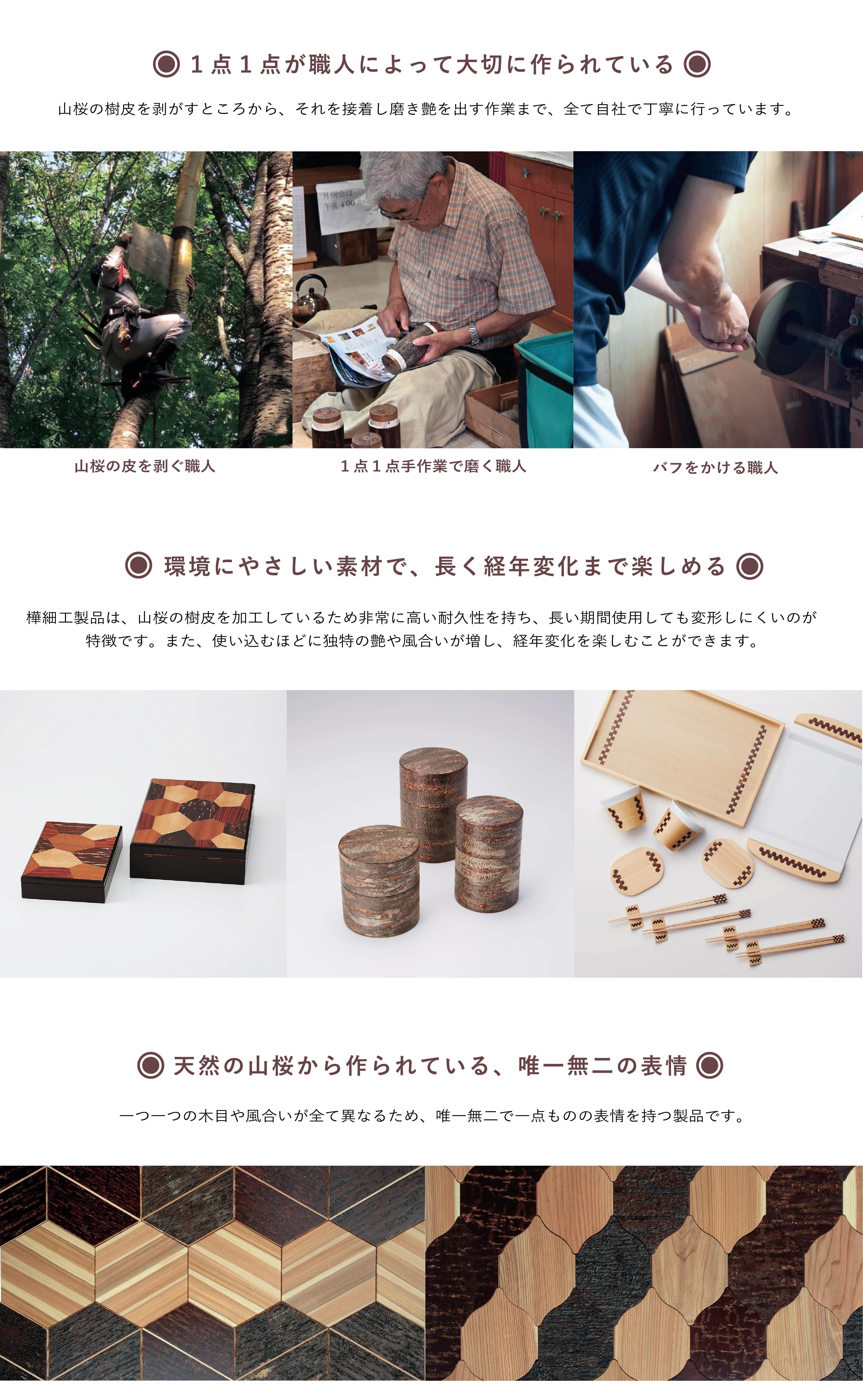 江戸時代中期に秋田県北部の阿仁地方に伝承された「山桜の樹皮」を利用した細工の技術を、佐竹北家の武士、藤村彦六が習得したことをはじまりとした、日本の伝統工芸品です。