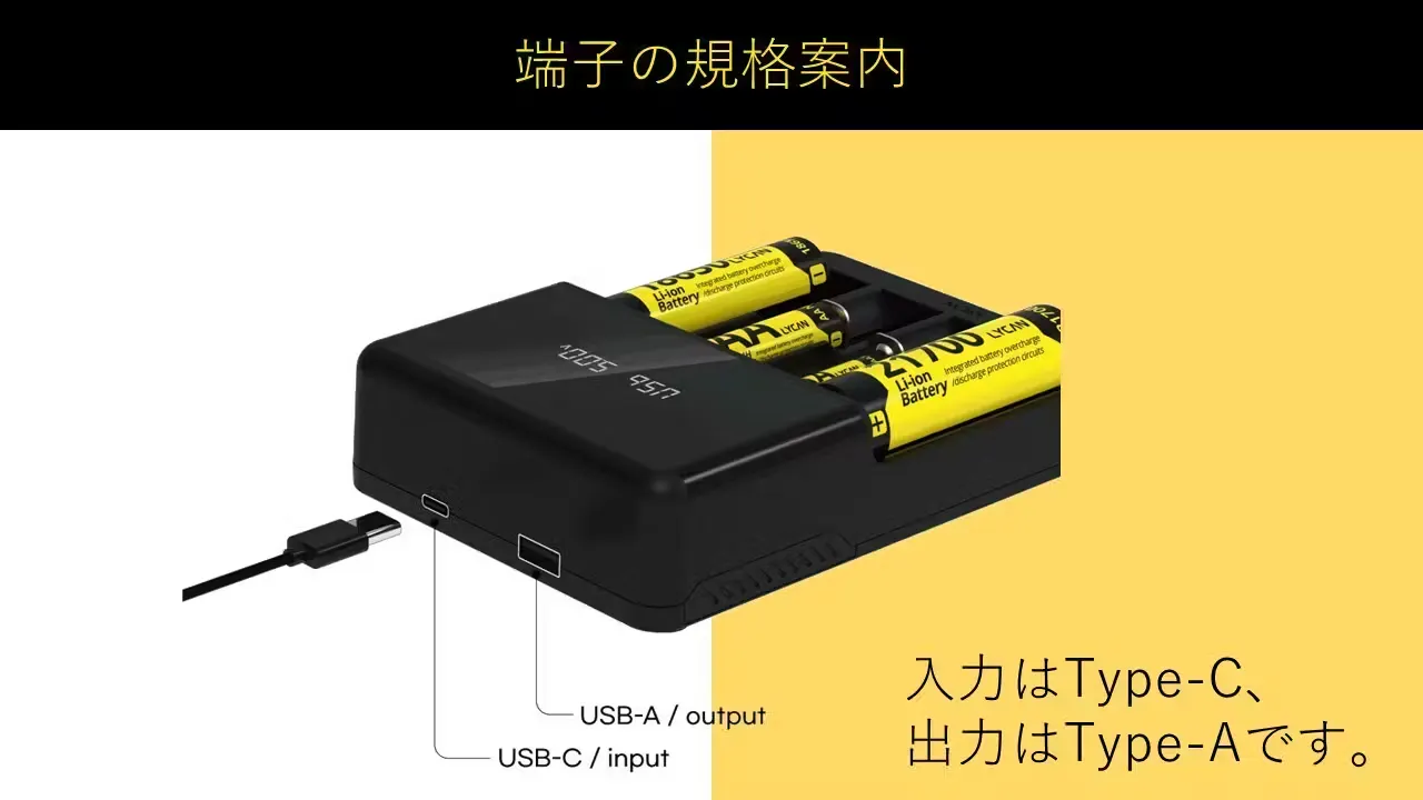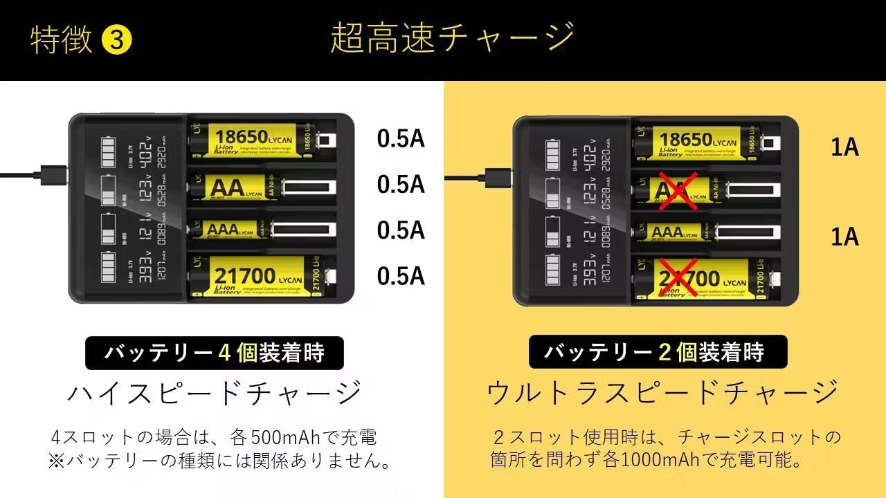 充電を急ぐ時には、2つのスロットのみ利用で超高速チャージが可能です。また、1番目と4番目のスロットは26650のようなやや大きめの充電池も使用可能です。