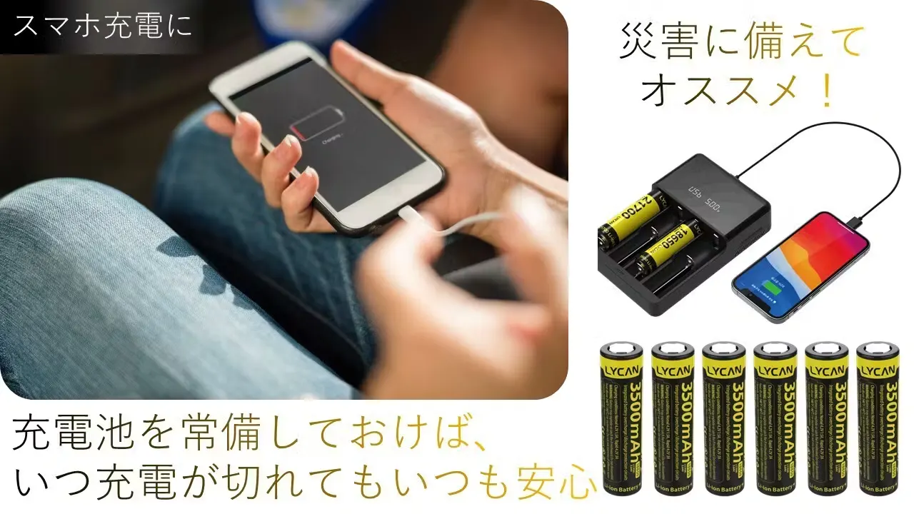 災害などに備えてお手元にある充電池をLYCANフリーボルトチャージャーでしっかり充電しておけば、万が一の時、充電に困りません。
