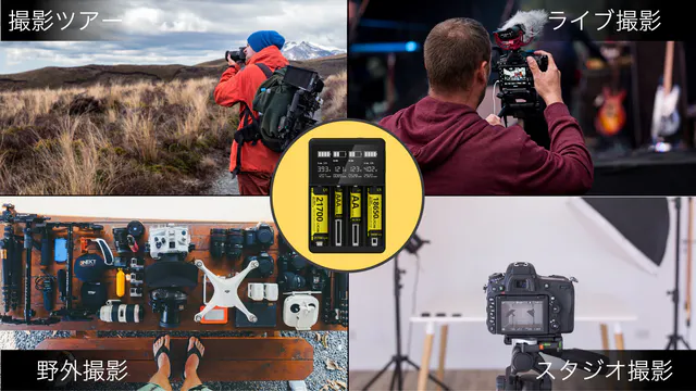 スタジオ撮影でも、ライブ撮影でもカメラを使う様々な場面で活躍できます。特に機材が多くなるほど、必要になる電池の数も多くなりますので、充電器を一つにまとめて、USB電源で充電することで現場対応の効率が非常に上がります。