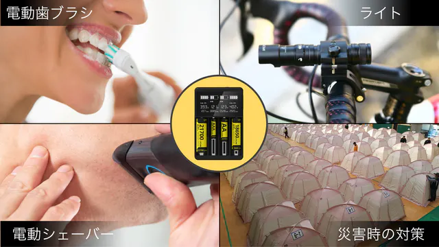 最近日常生活で、一般化している電動歯ブラシはもちろん、旅行先でよく使うポータブルシェーバーを含め、ライト、ラジオなどの充電池を使う様々な機器にもオススメです。特に災害時の避難所では電気を中々自由に使えない時が多いので、DC/USB電源で充電池のチャージができる機能はとても役に立ちます。