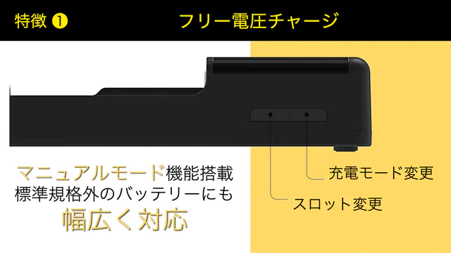 バッテリーの回路を自動解析し、充電池の種類やそれぞれの電圧に合わせチャージします。しかも、各スロット毎に充電状況や充電池の種類を把握できるシンプルで実用的なインターフェースになっております。