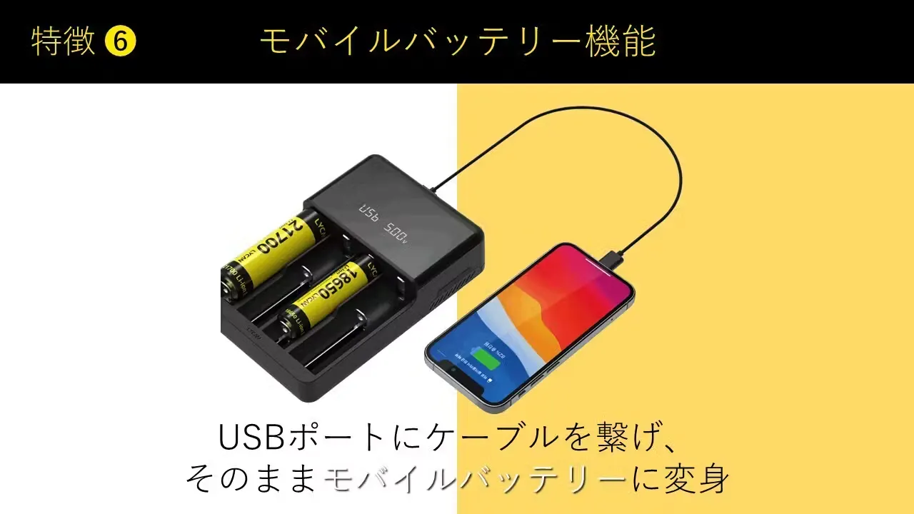 ※モバイルバッテリー機能はリチウムイオン充電池の場合に限りご使用が可能になります。Ni-Cd、Ni-MH、アルカリ乾電池は電圧が低いためモバイルバッテリーとしてのご使用はできません。