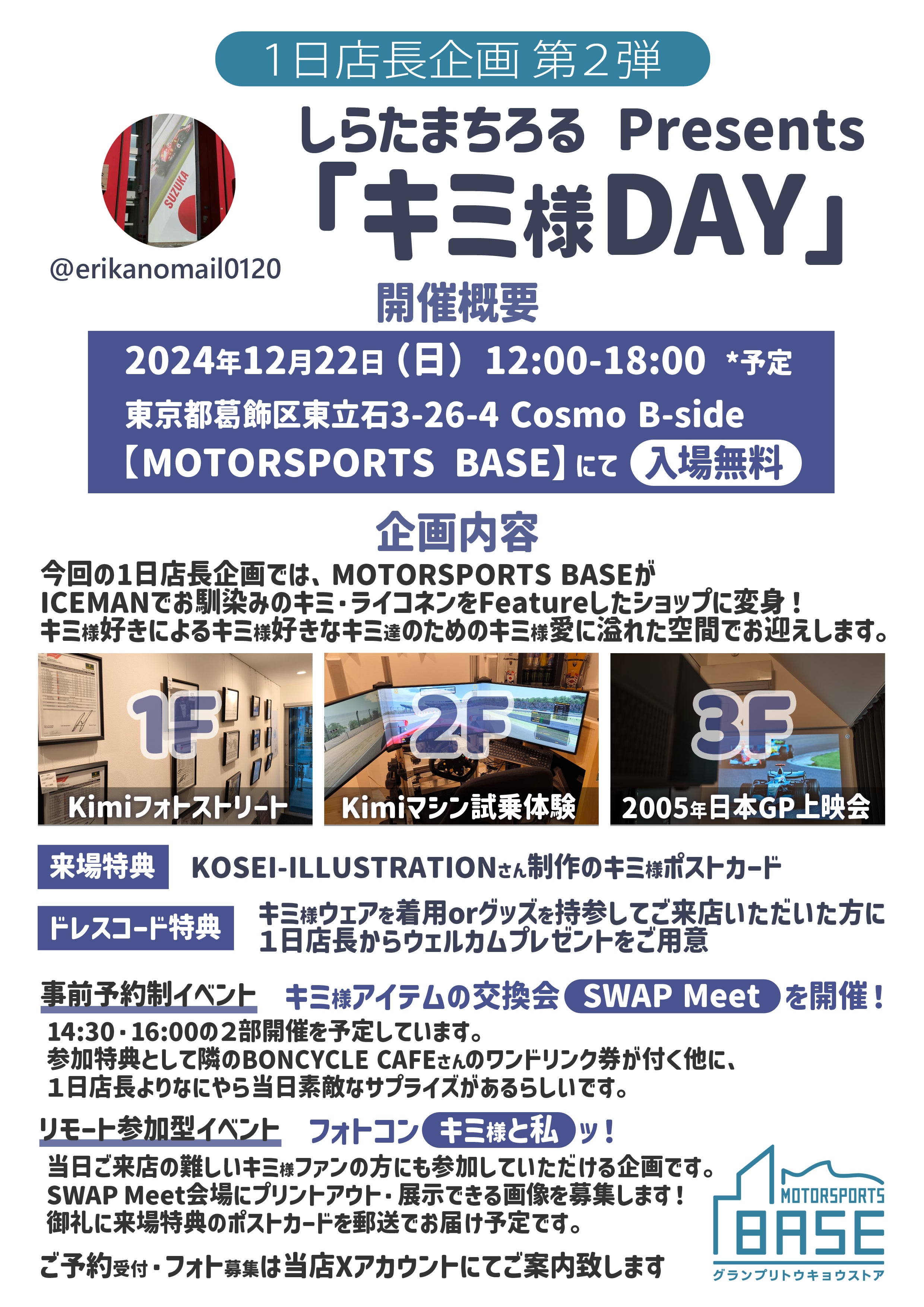 2024/12/08 20:35昨日に続きお知らせです。当クラウンドファンディング発の一日店長企画、第2弾の開催が決定しております。◆開催日時 2024年12月22日(日) 12:00~18:00◆開催場所 東京都葛飾区東立石3-26-4 Cosmo B-side 【MOTORSPORTS BASE】この1日は、キミ・ライコネンにスポットを当てたお店として営業します。溢れる愛を詰め込んだ情報量たっぷりのフライヤーになってしまったので、さてどうしたものか...とお考えの方にとって参考になればと思い、ざっくりと適性(?)を図解してみました。一言でまとめると、キミ様への愛の大きさに正比例してよりディープに楽しめる内容、ということで間違いないでしょう。ファンミーティングの一種という括り方もできますが、・一日店長の燃え滾る情熱に・専門店だからこそ味わえる雰囲気と・GRANDPRIXならではの仕掛けを添えて精一杯おもてなし致しますので、きっと楽しんでいただけると思います。ご来店を心よりお待ちしております! もっと見る