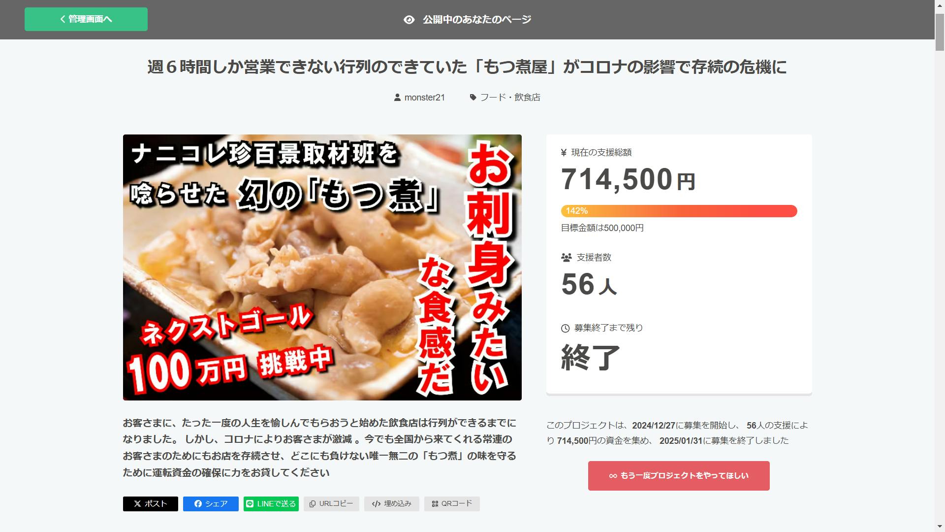 当店のクラウドファンディングを見ていただき誠にありがとうございます