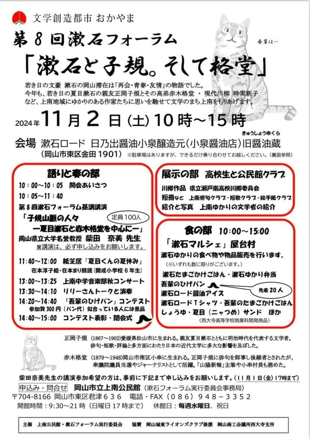 さらに!コアな漱石ファンの方々には岡山県立大学名誉教授・山陽学園大学非常勤講師・岡山県俳人協会会長 柴田奈美先生による「子規山脈の人々ー夏目漱石と赤木か格堂を中心に一」の講演をいただきます!