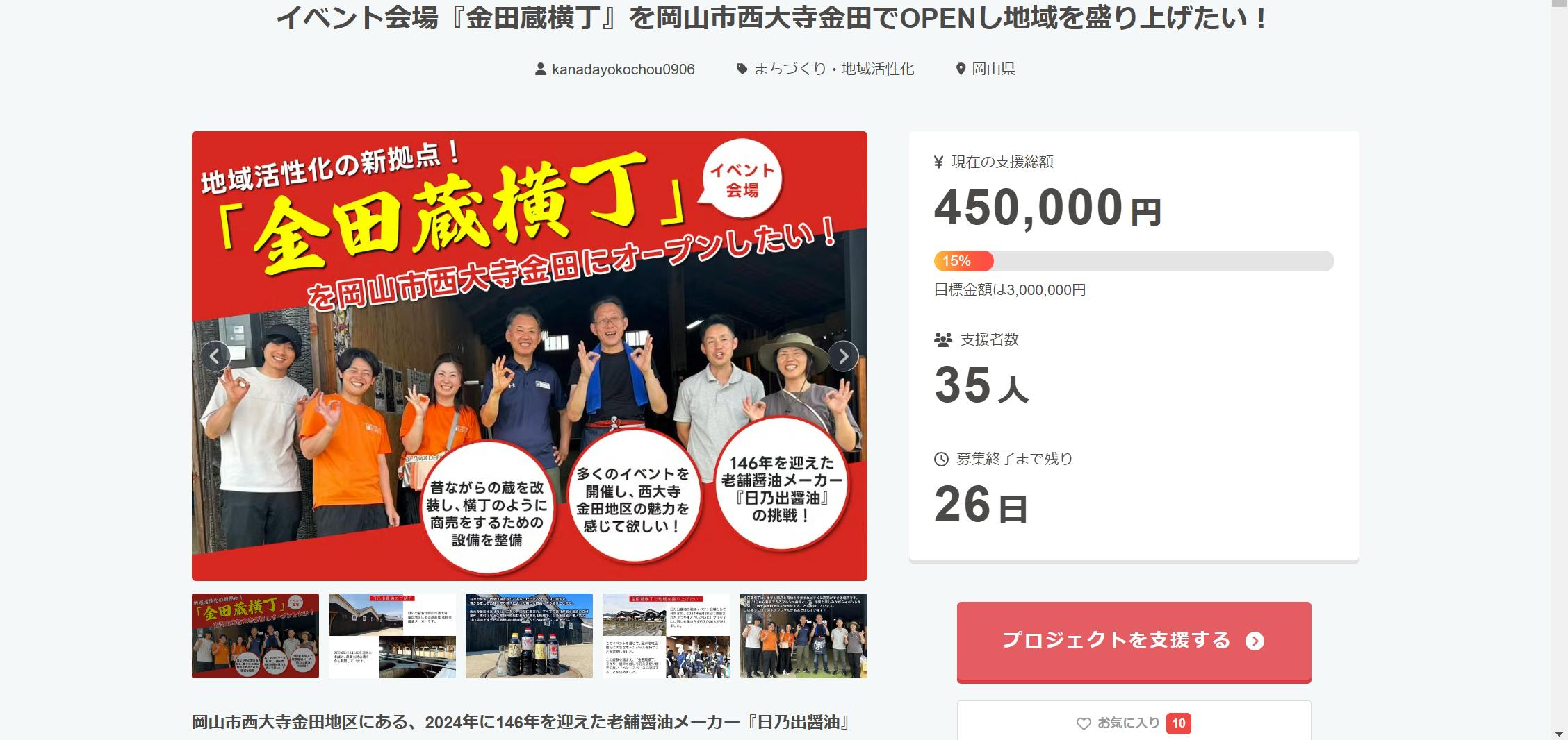 2024/12/22 20:58「金田蔵横丁」プロジェクト クラウドファンディング終了のご報告と心からの感謝<ご報告とお礼>プロジェクト期間:2023年10月〜11月末最終支援総額:635,500円まずは温かいご支援をいただき、誠にありがとうございました。<プロジェクトに懸ける想い>金田蔵横丁は地域の皆様や、西大寺を訪れる人々に開かれたコミュニティを提供する場です。伝統と革新が共存する新しい西大寺の発信拠点として、誰でも気軽に商いを始められる開かれた空間を目指しています。地域内外の方々の新たな出会い、夏目漱石ゆかりの地としての歴史文化の発信、新たな観光スポットとしての機能など西大寺地区の新しいランドマークとなれるよう今後も邁進していきます。<今後の展開>残念ながら目標金額には届きませんでしたが、私たちの想いに多くの方々が共感してくださったことを、大変心強く感じております。このプロジェクトは、募金活動という新たな形で継続して参りますので、引き続き応援のほど、よろしくお願いいたします。<今後の募金活動について>今後は地域に根ざした形での資金募集を予定しております。※詳細は追ってご案内させていただきます。<返礼品・広告協賛枠について>返礼品につきましては2025年1月中に発送させていただきます。広告協賛枠は後日蔵ホールにて掲載させていただきます。<支援者の皆様に感謝を込めて>クラウドファンディングでご支援くださった皆様、応援のお言葉をくださった皆様、すべての方々に心より感謝申し上げます。私たち日乃出醤油は、西大寺を盛り上げる先蜂として今後も様々な取り組みを継続していきます。この金田蔵横丁を、西大寺の新たなランドマークとして、また地域コミュニティの核として育てていけるよう、引き続き努めて参ります。今後とも変わらぬご支援を賜りますよう、よろしくお願い申し上げます。 もっと見る