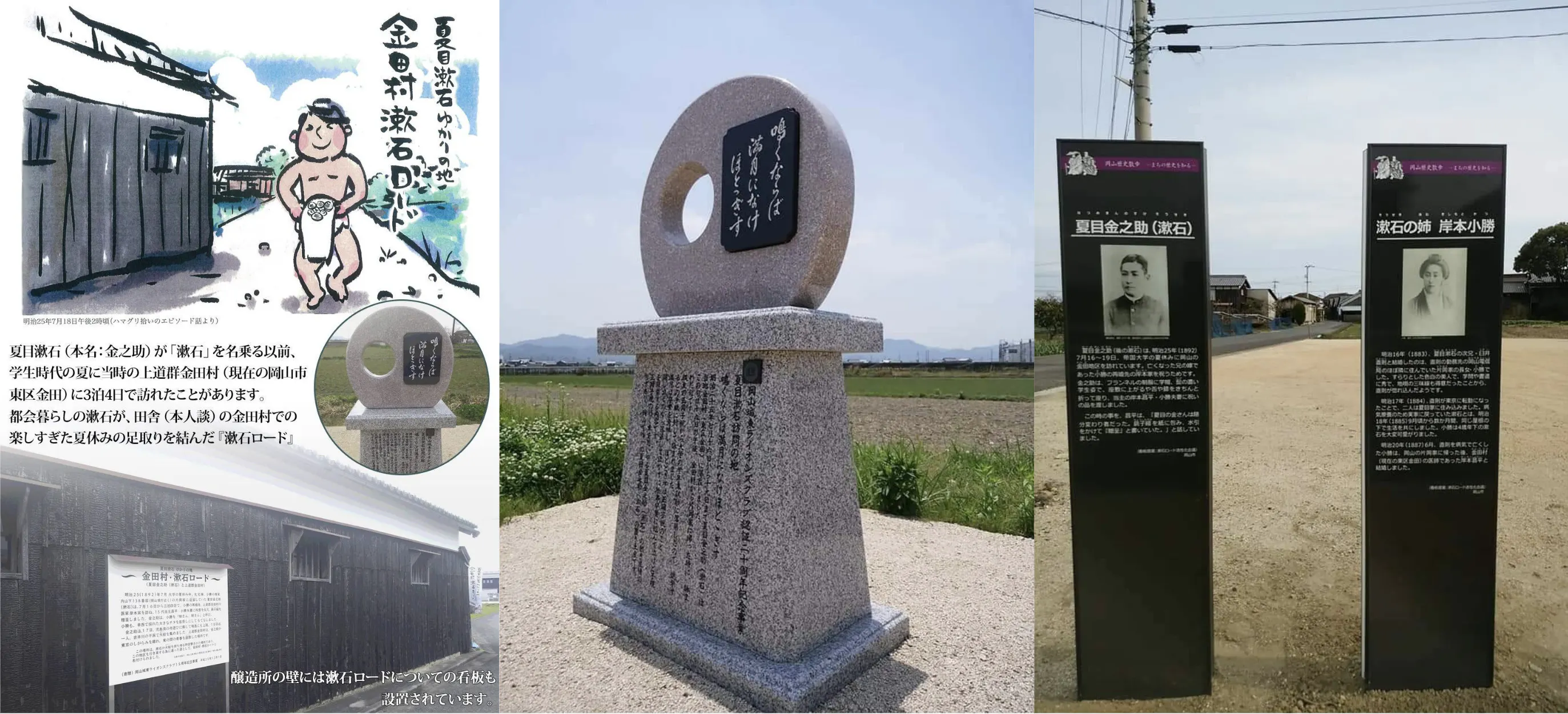 夏目漱石(本名:金之助)がまだ「漱石」を名乗る以前、学生時代に当時の上道郡金田村(現在の西大寺金田地区)に3泊4日で訪れたことがあります。