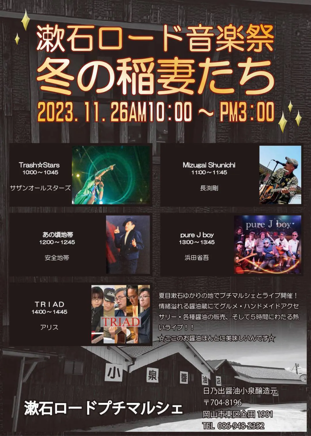 支えてくださった地域の方への感謝を込めて、西大寺金田地区で何か喜んでもらえるような催しができないかを考え2015年頃から日乃出醤油の蔵でイベントを開催してきました。