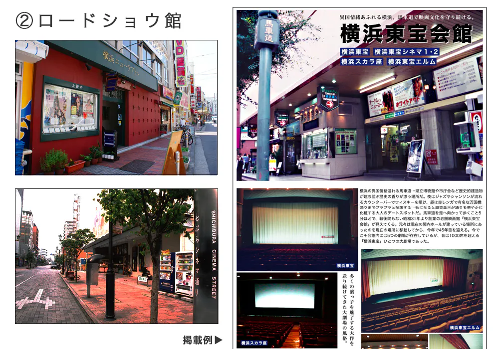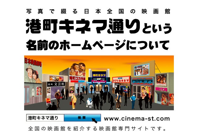 『港町キネマ通り』というホームページは仮想の映画街です。昭和の時代にどこの街にもあった懐かしい映画街をネット上で再現しました。通りにある5つの映画館は、①ミニシアター ②ロードショウ(封切)館 ③名画座 ④シネマコンプレックス ⑤成人映画館 で構成されており、それぞれの建物をクリックすると日本全国の映画館を見ることが出来ます。