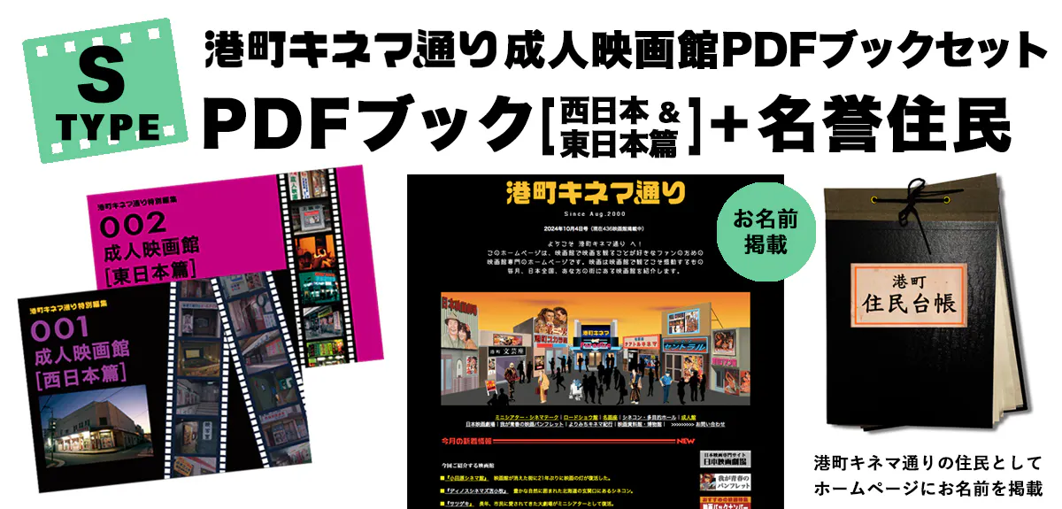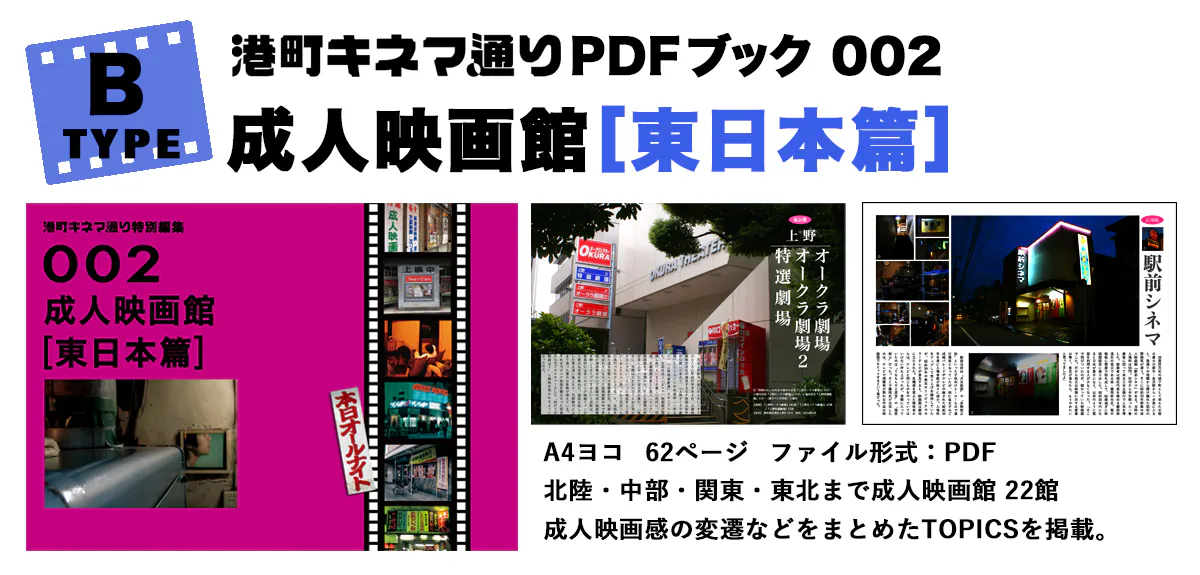 今回のプロジェクトでは、『港町キネマ通り』の膨大な映画館記録の中でも特に人気が高い成人映画館「西日本篇(58P)」「東日本編(62P)」の高解像PDFブックをリターンとしてご用意しました。昭和から手付かずの映画館も多いので貴重な写真が満載です。他にも成人映画に関係する出来事や時事ネタ、ロビーで販売されていた冊子など令和の世の中では考えられないような珍品をトピックスで取り上げています。成人映画館ひとつ取っても西日本と東日本の文化の違いが垣間見えて面白いですよ。