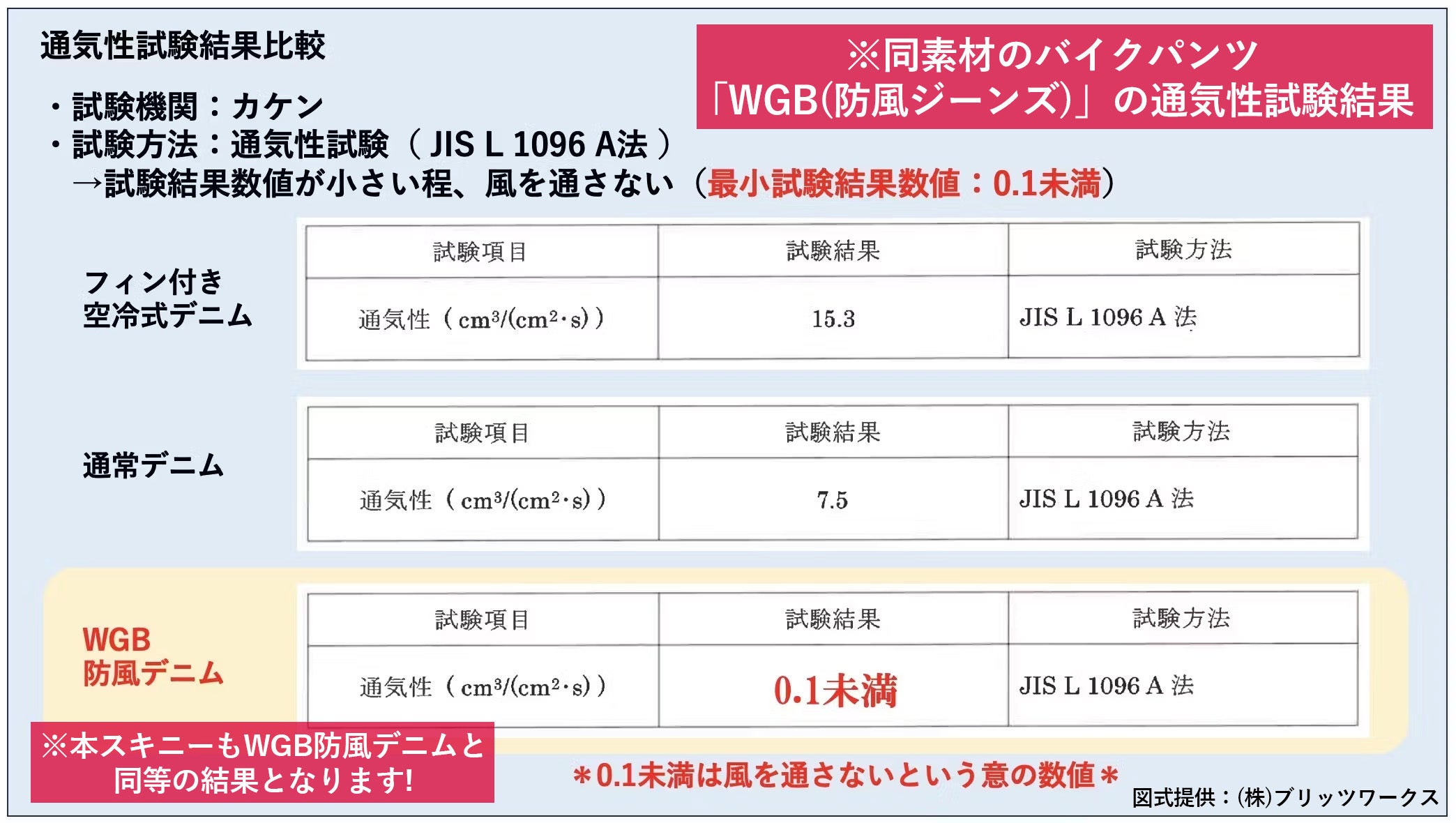 第三者試験機関でパンツの防風性能を調べ、通気性試験の証明書も取得。