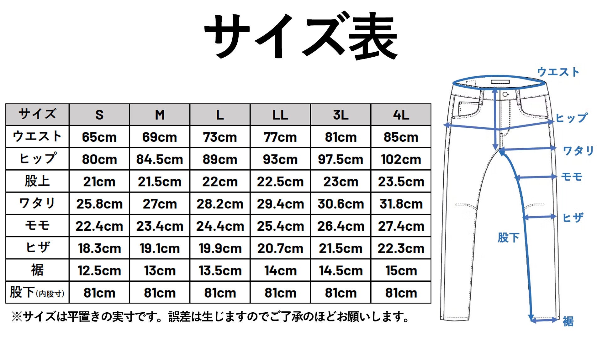 -ウエストサイズ:S(65cm)、M(69cm)、L(73cm)、LL(77cm)、3L(81cm)、4L(85cm)・・・下記寸法表参照