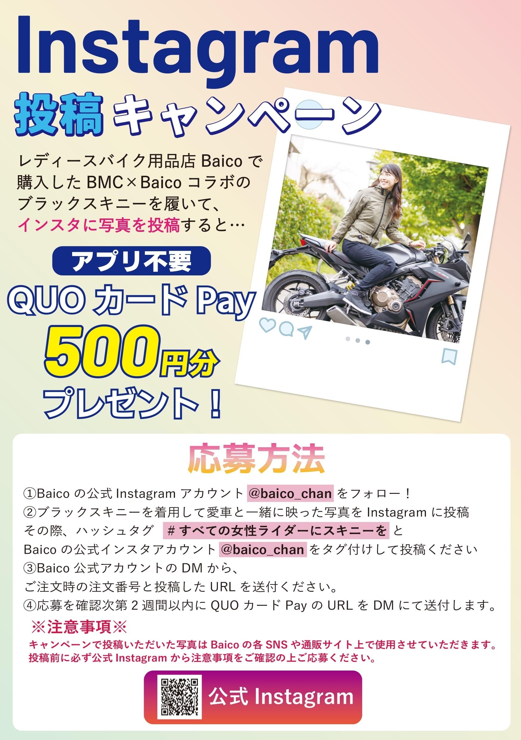 2024/09/27 14:16こんにちはレディースバイク用品店Baicoスタッフです。お待たせいたしました!メッセージでもご案内をさせていただきましたが、皆さまにご支援いただきましたリターン品は本日9/27(金)に弊社倉庫から発送いたします。夕方以降にメールアドレス宛にご連絡がいきますので、ご確認のほどよろしくお願い申し上げます。・・・長かった夏日も終わりすっかり秋めいてきて、防風スキニーの出番も近いですね^^防風スキニーを履いてツーリングに行かれましたら、ぜひ下記キャンペーンにご応募くださいね!★インスタ投稿キャンペーンのお知らせ★届いた防風スキニーを着用したお写真をInstagramに投稿いただいた方に、QUOカードPay500円分をプレゼントいたします♪詳細はリターン品に同封するチラシor当店のInstagramをご確認ください!※画像やInstagramの投稿内容にはブラックスキニーと記載がありますが、防風スキニーも対象商品となりますのでご安心ください◎Instagram:https://www.instagram.com/p/C6IHcsPJKZZ/?utm_source=ig_web_copy_link&igsh=MzRlODBiNWFlZA== もっと見る【重要】商品発送"前"のサイズ変更・商品発送"後"のサイズ交換について