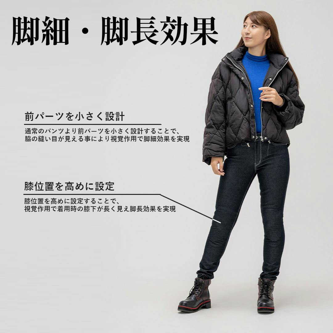 脇の縫い目が見える事により視覚作用で脚細効果を実現しています。