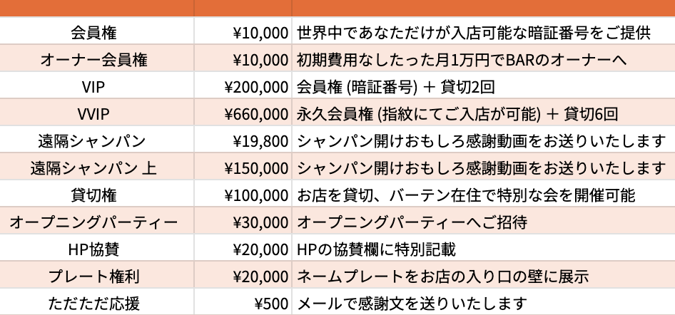 ■ bar T³の会員特典(通常 3万円)→ リターンの会員権にて1万円