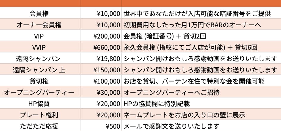 ■ bar T³の会員特典(通常 3万円)→ リターンの会員権にて1万円