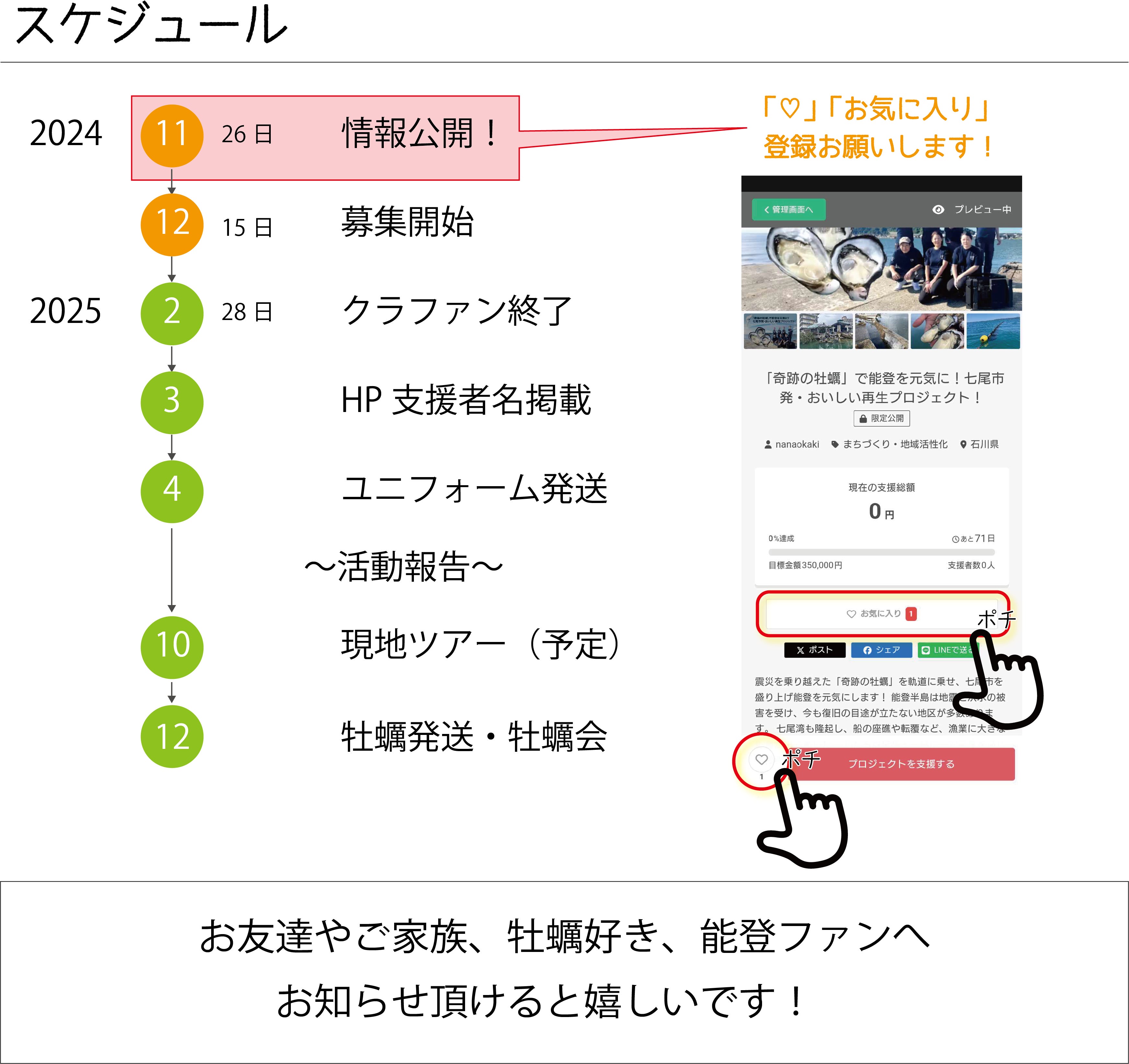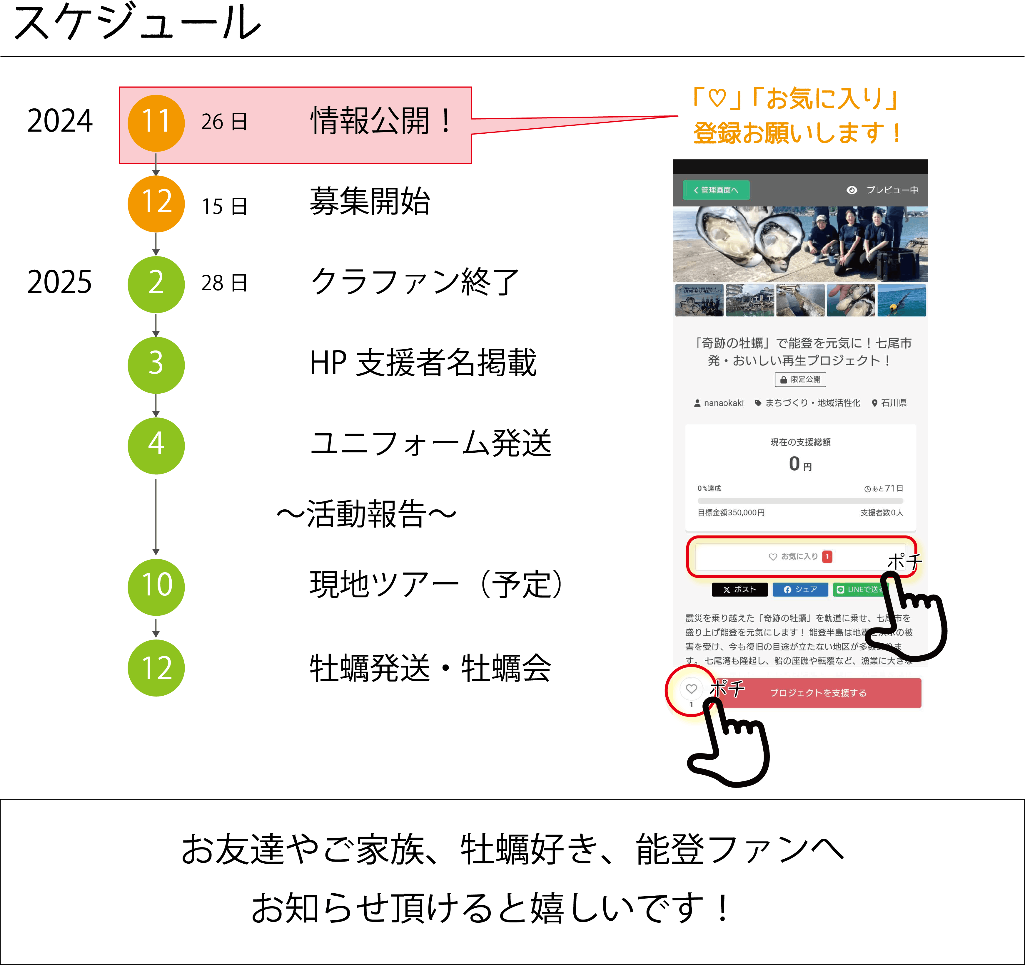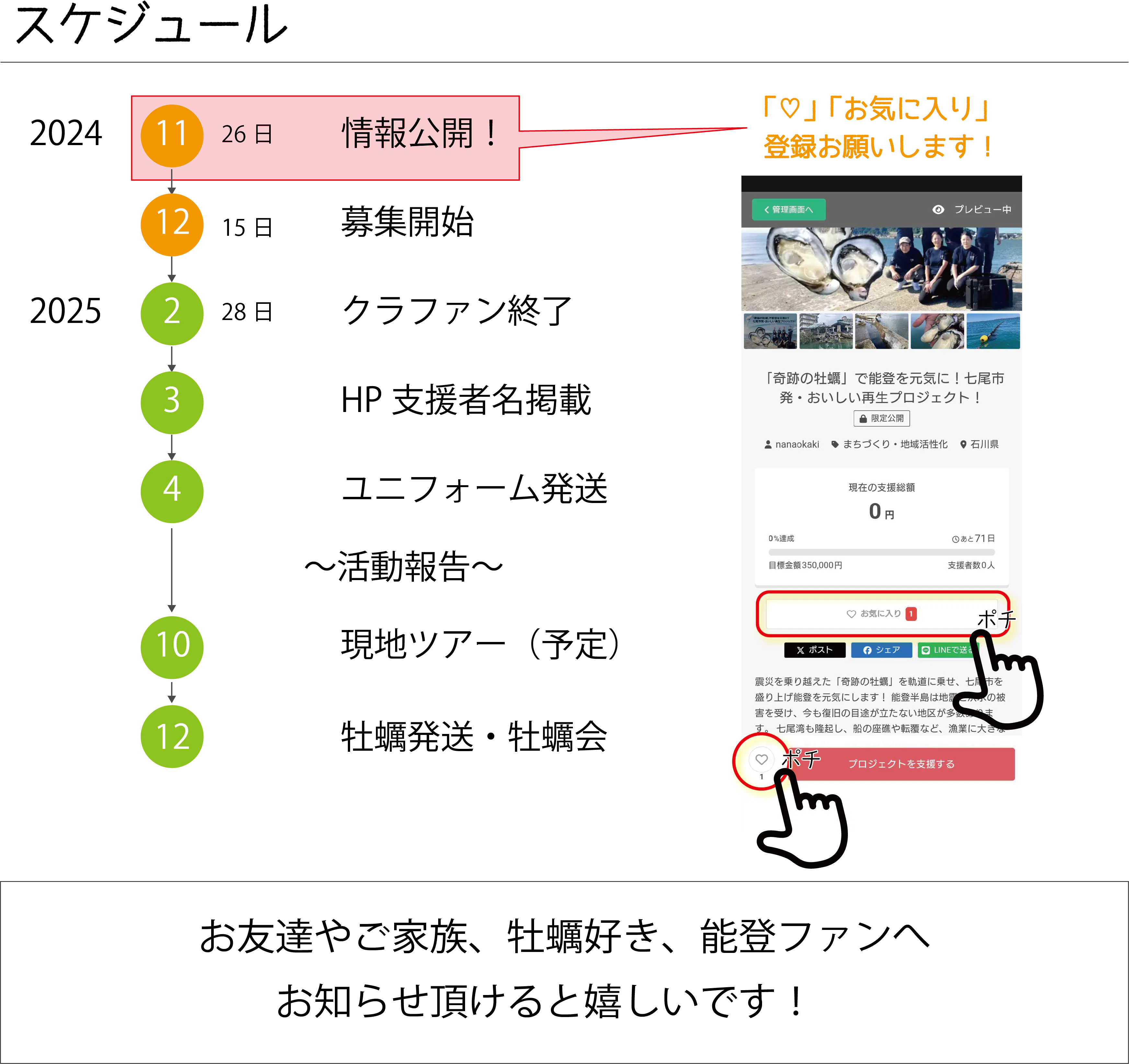 プロジェクトへのご参加や、七尾牡蠣のことを周りの方へお伝えて頂けたら嬉しいです。