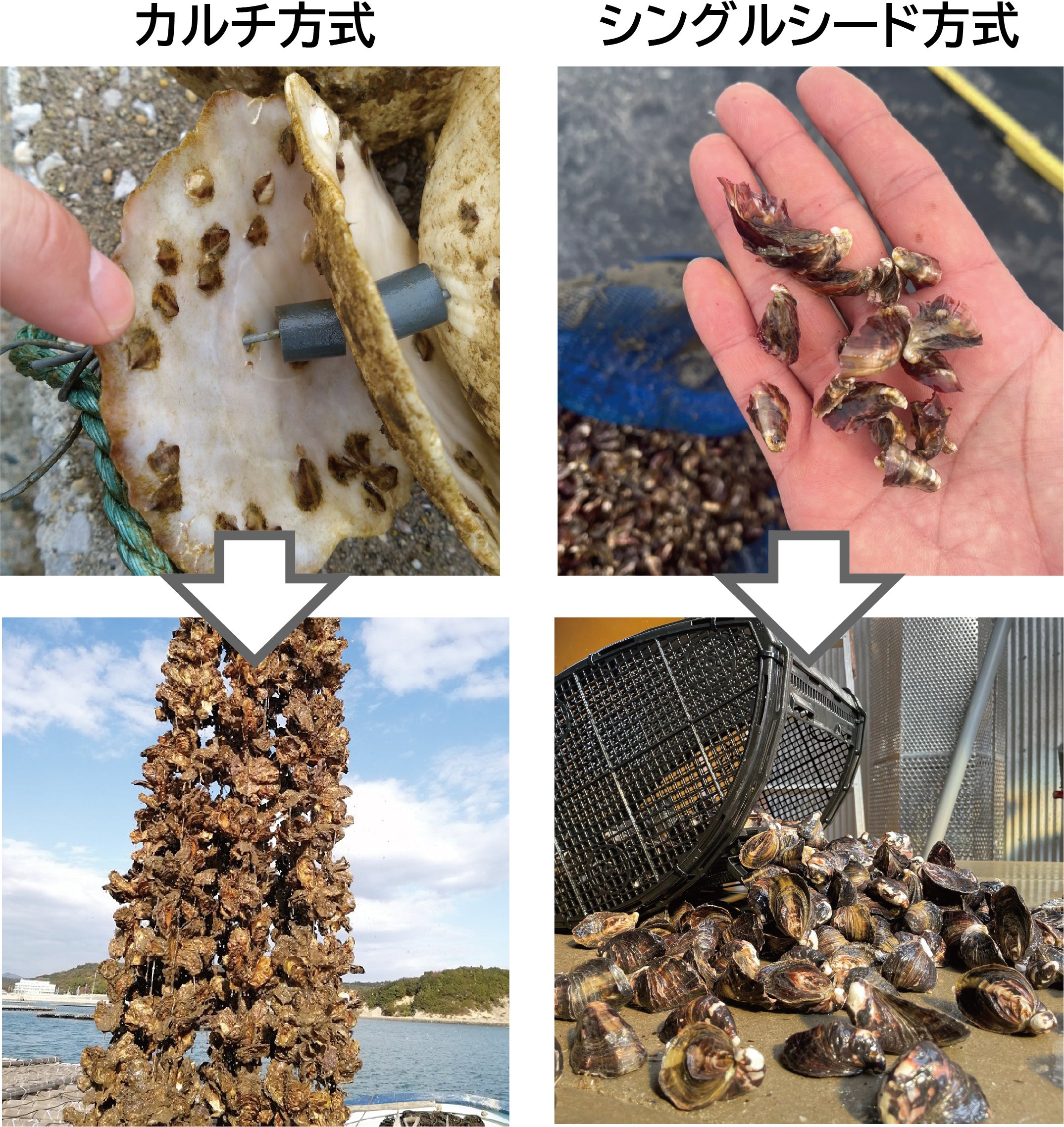 安定的な漁業をつくろうと「獲る漁業」から「育てる漁業」への模索をする中で、県外の知り合いの漁業者たちにも相談したところ、牡蠣の”シングルシード”という、県内ではまだ珍しい養殖方法に出逢いました。