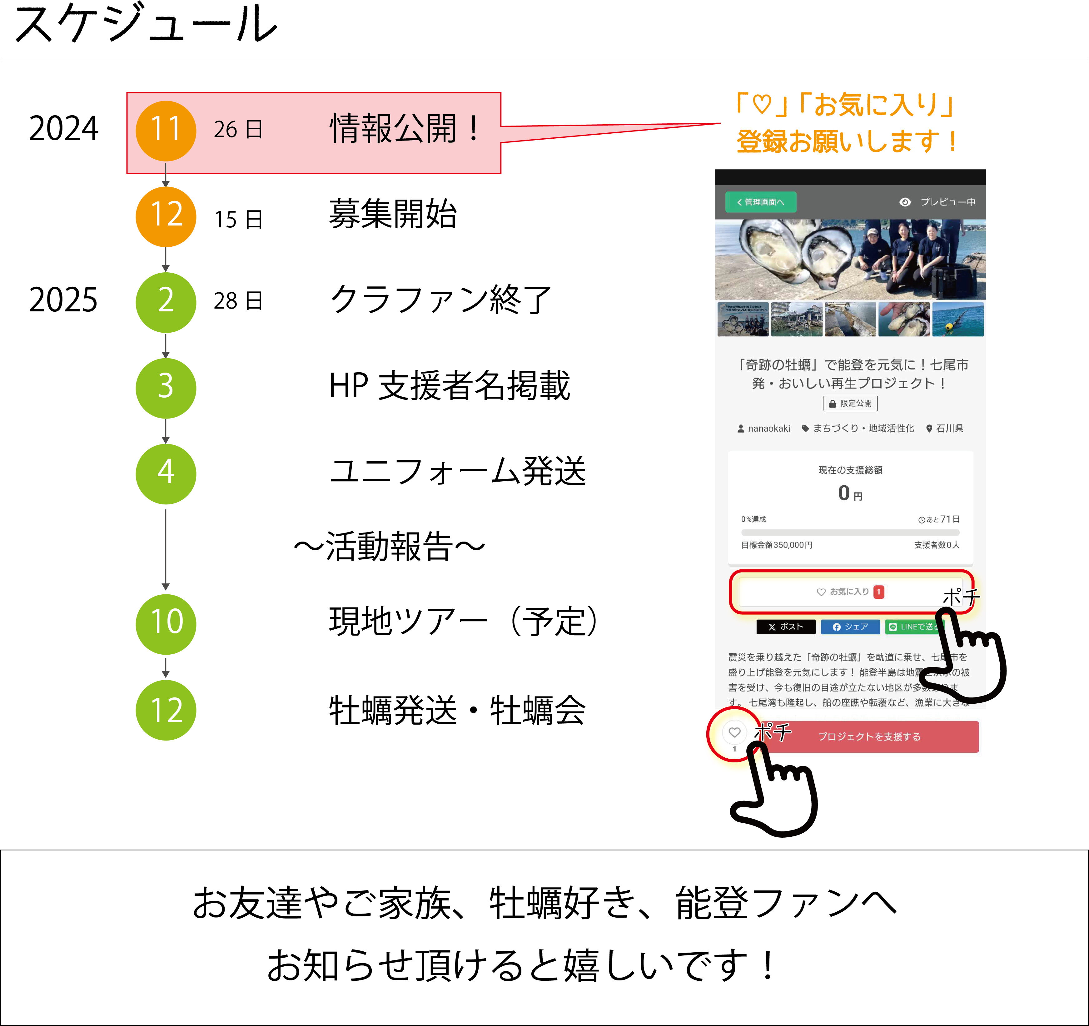 プロジェクトへのご参加や、七尾牡蠣のことを周りの方へお伝えて頂けたら嬉しいです。