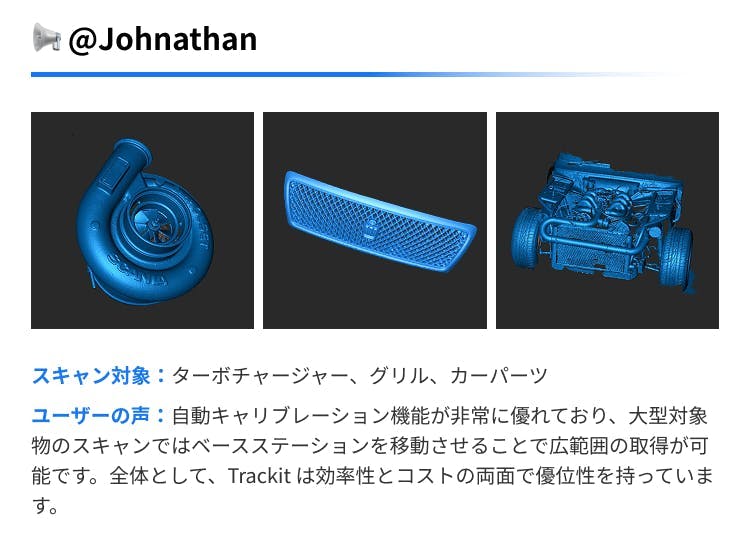 Trackit 工業用光学トラッキング式 3D スキャナーは、発売以来、製造・検査・設計などの専門分野のユーザーから幅広い注目を集めています。その性能をより直感的に感じていただくために、さまざまな業界から選ばれたテストユーザーのリアルな使用事例を厳選し、皆様にご紹介いたします。