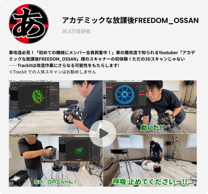 3Dスキャン業界やメイカーズ界隈で活躍する複数の人気インフルエンサーが、YouTubeや各種SNSにて Trackit のリアルレビューを公開!様々な環境・被写体を使った全方位実証レポートでその実力をご確認ください。