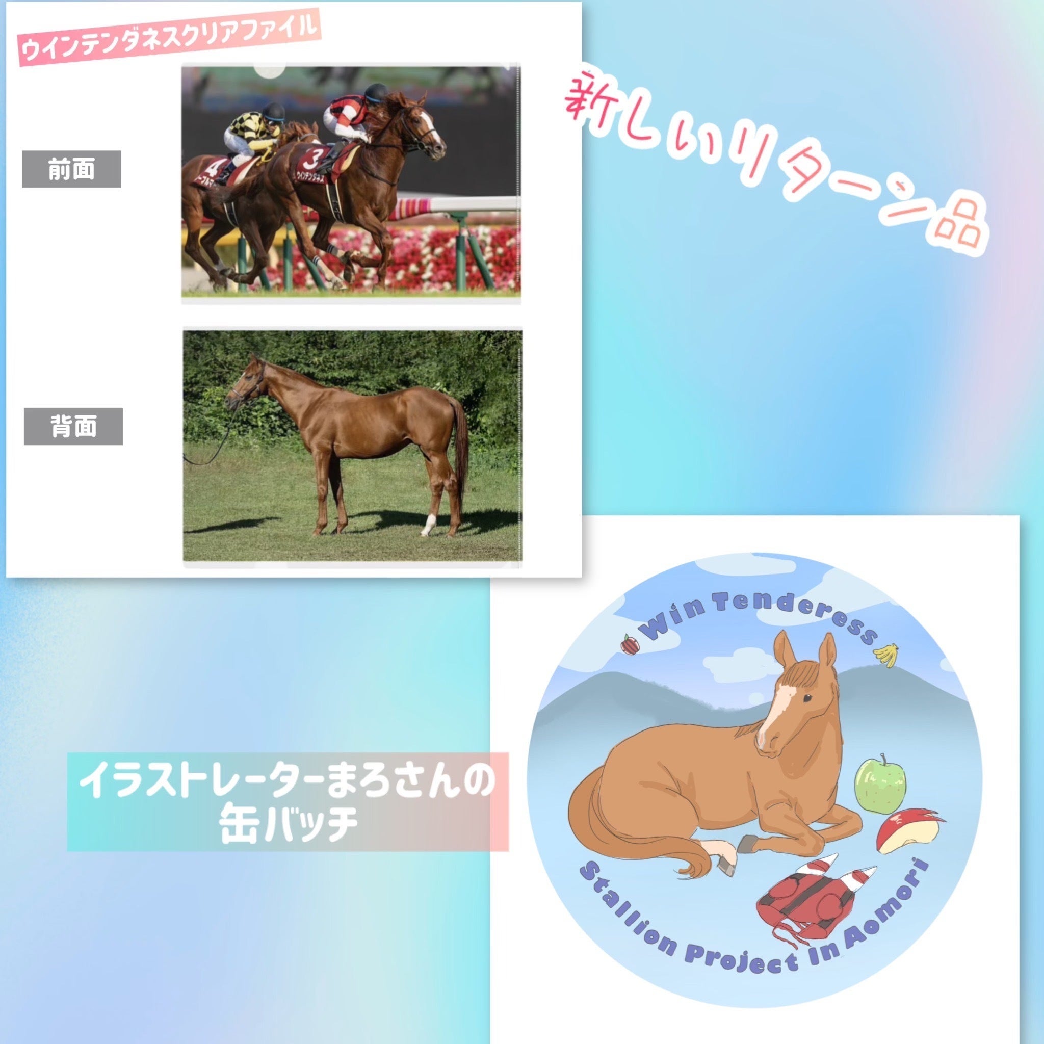 青森ホースファーム協力のもと、たてがみストラップ、プロジェクトピンバッジ、ウインテンダネス以外の繫養・預託されている馬たちとのふれあい、乗馬体験、命名権などをご用意させていただきます。