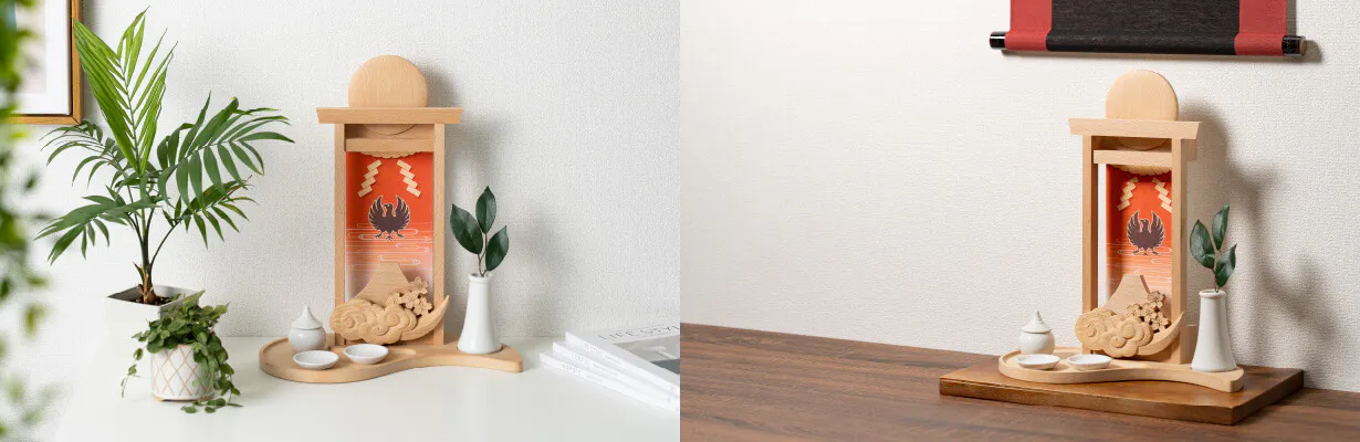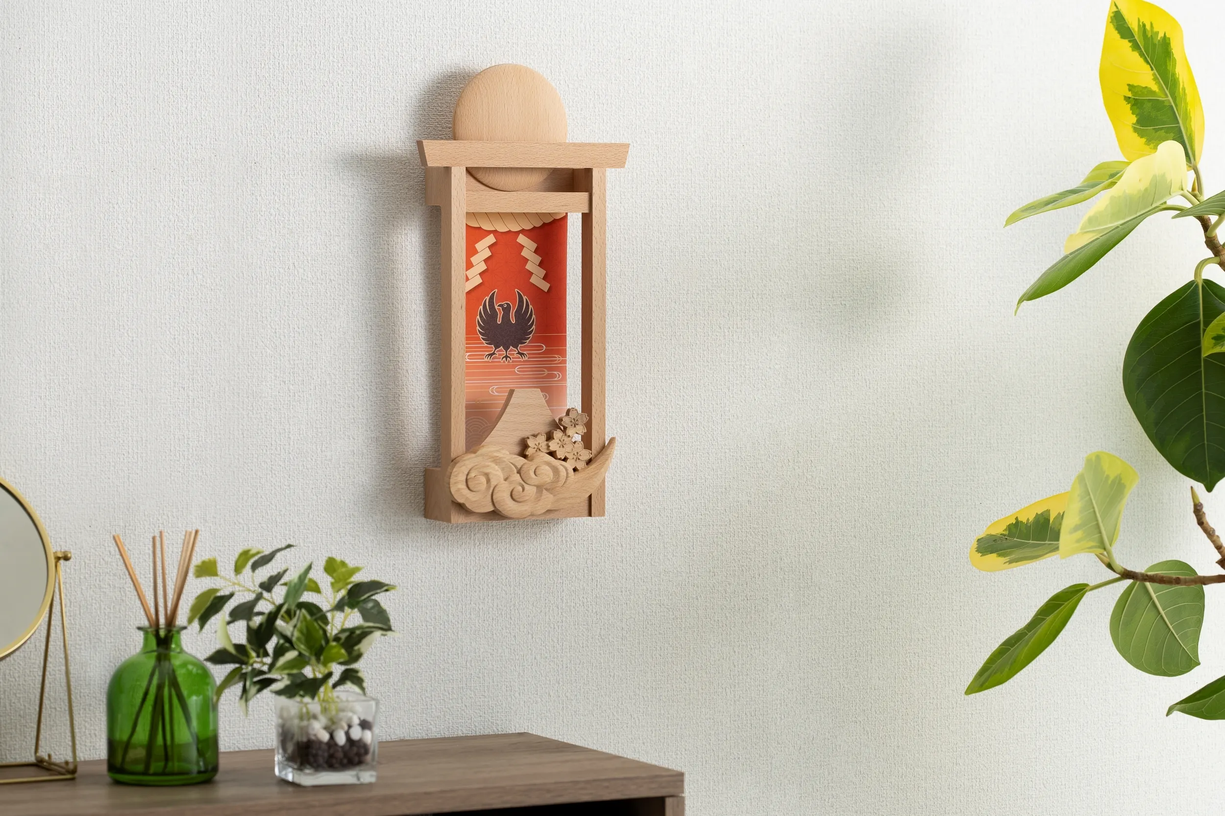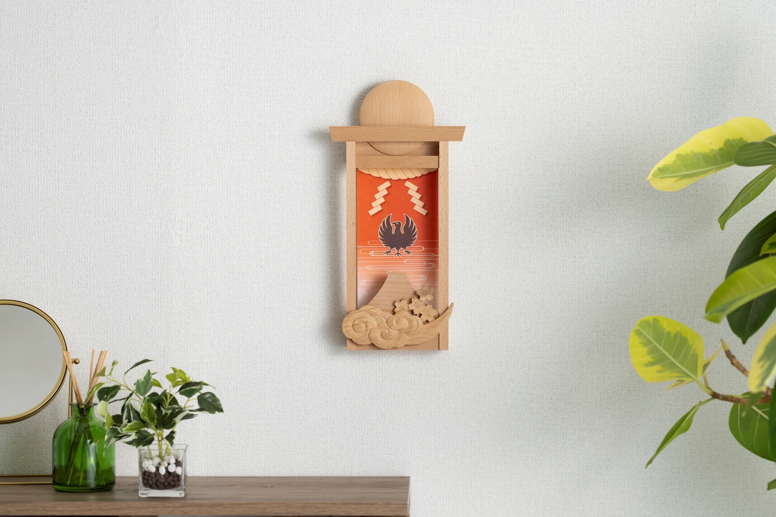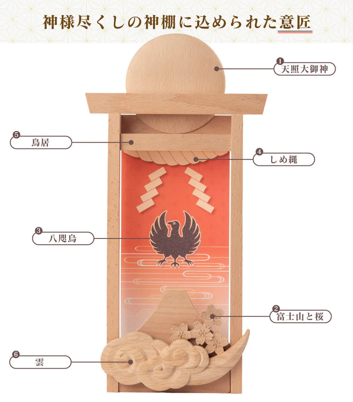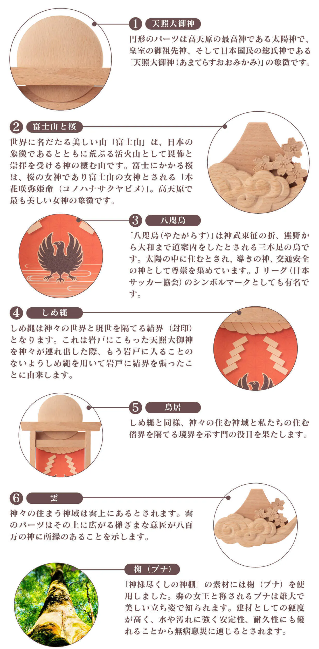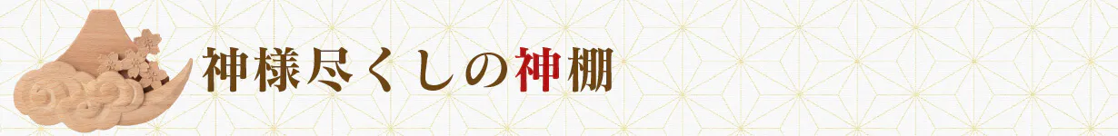 尚、『神様尽くしの神棚』および『神様尽くしの神棚 Kamukura』は、最下部に雲のパーツを配されていますので、その上に広がる様々な意匠の全てが神域であることを表現しています。何より、その頂に太陽神である天照大御神を象徴する円形のパーツが配されておりますので、お祀りする場所に特別な配慮は必要ございません。